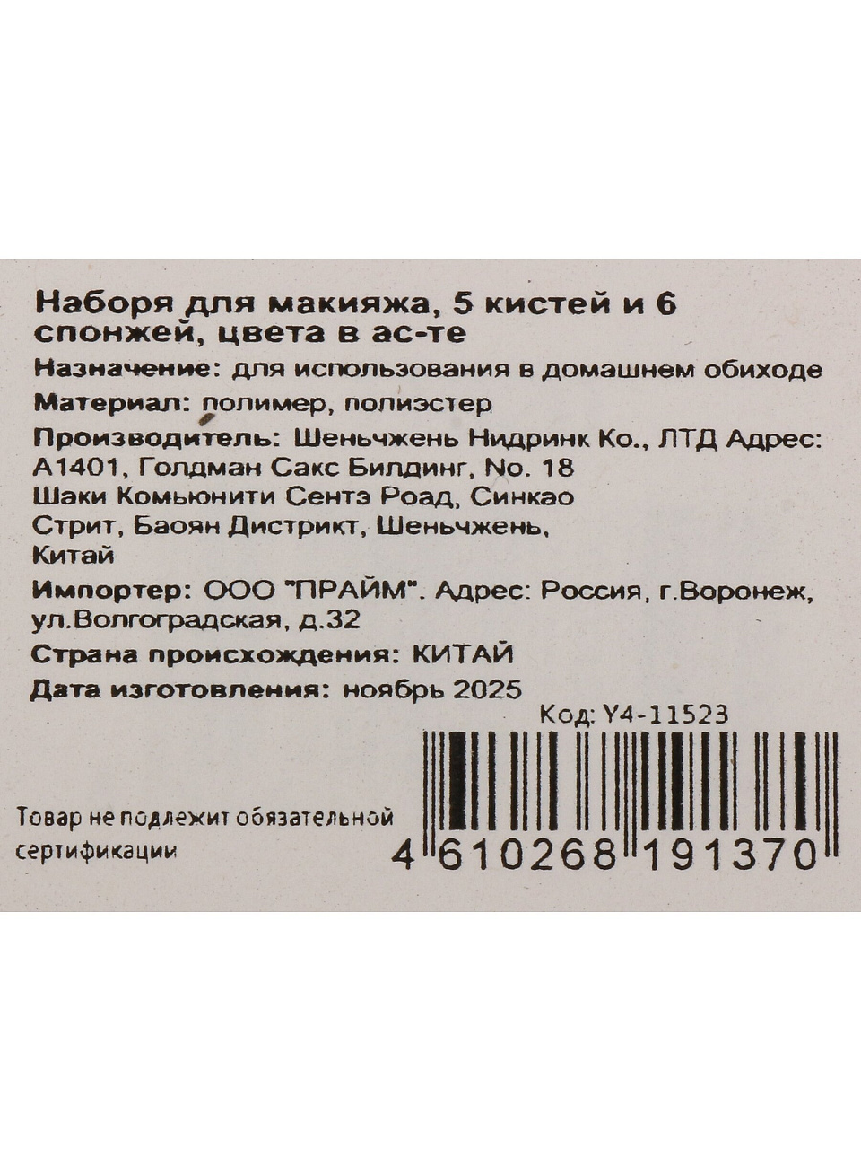 В наборе: 5 кистей с мягким синтетическим ворсом и 6 спонжей из гипоаллергенного латекса. Цвета в ассортименте, страна производства — Китай, артикул Y4-11523.