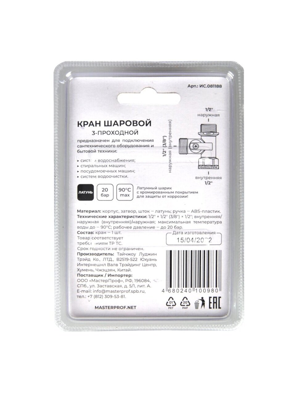 Вы можете приобрести «Кран для бытовых приборов, 1/2" х1/2"(3/8") х 1/2", ш-ш(г)-ш, трехходовой, индивидуальная упаковка, MasterProf» и другие товары в нашем интернет-магазине в Серпухове по низким ценам и с бесплатным самовывозом.