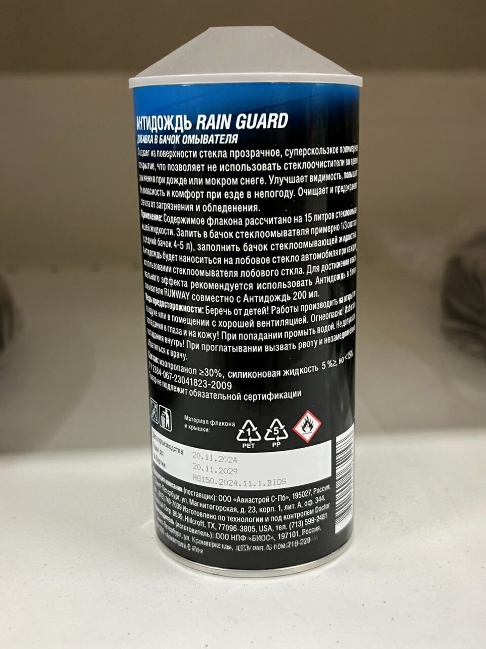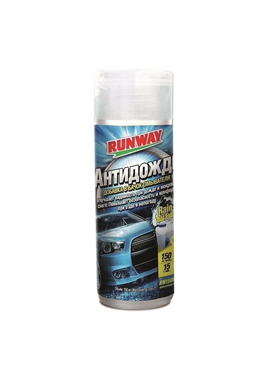 Так как погодные условия России суровы, специально для них создано средство Runway. Основной состава стала комбинация силиконов, создающих скользящее покрытие, снижающее трение дворников. Кроме предотвращения появления влаги обладает свойством защищать стекла от наледей и грязевых шапок. Антидождь предназначен для наружной обработки зеркал, фар и стекол автомобилей, мотоциклов, моторных лодок и катеров.