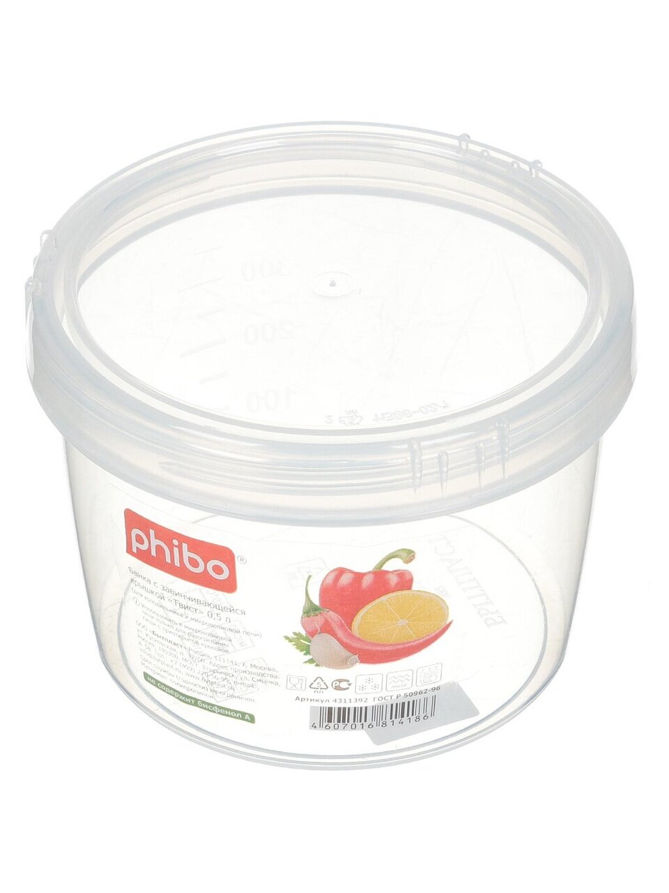 Банка «Твист» имеет винтовую крышку и подходит для хранения, замораживания и разогревания в микроволновой печи (без крышки) различных продуктов и готовых блюд. Наполненную банку можно перевозить, не опасаясь, что крышка откроется. Прозрачные корпус и крышка позволяют видеть содержимое, а мерная шкала на корпусе поможет определить объем продукта. Банки можно ставить одну на другую для экономии места в холодильнике или кухонном шкафу. Можно мыть в посудомоечной машине.