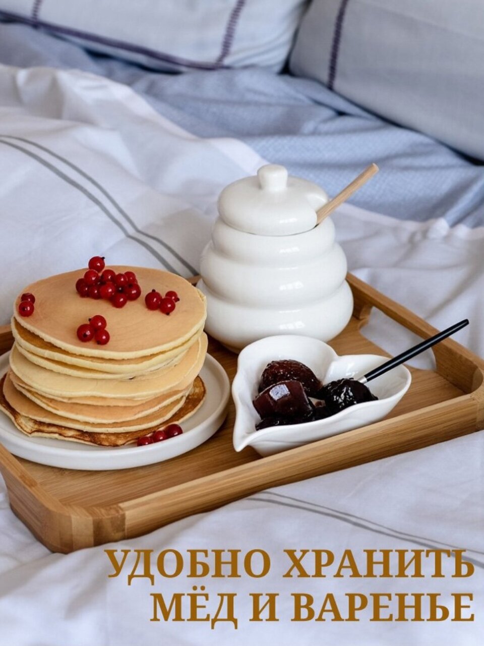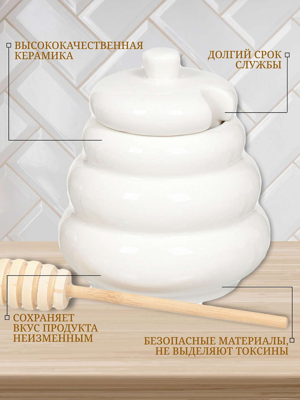 Банка для меда – удобный аксессуар, который станет оригинальным украшением в интерьере вашей кухни. В комплект входит удобная деревянная ложка. Емкость идеально подойдет для хранения и подачи меда, сиропа и патоки. Посуда идеально подходит как для повседневного использования, так и для праздничной сервировки.