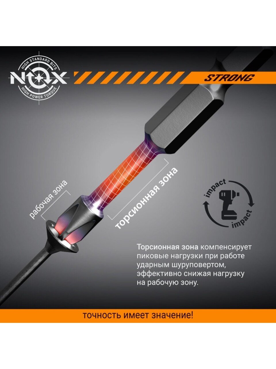 - Наличие торсионной поверхности позволяет эффективно распределять возникающее при работе давление. Это снимает чрезмерную нагрузку и повышает ударную прочность наконечника биты, что значительно увеличивает срок использования насадки.