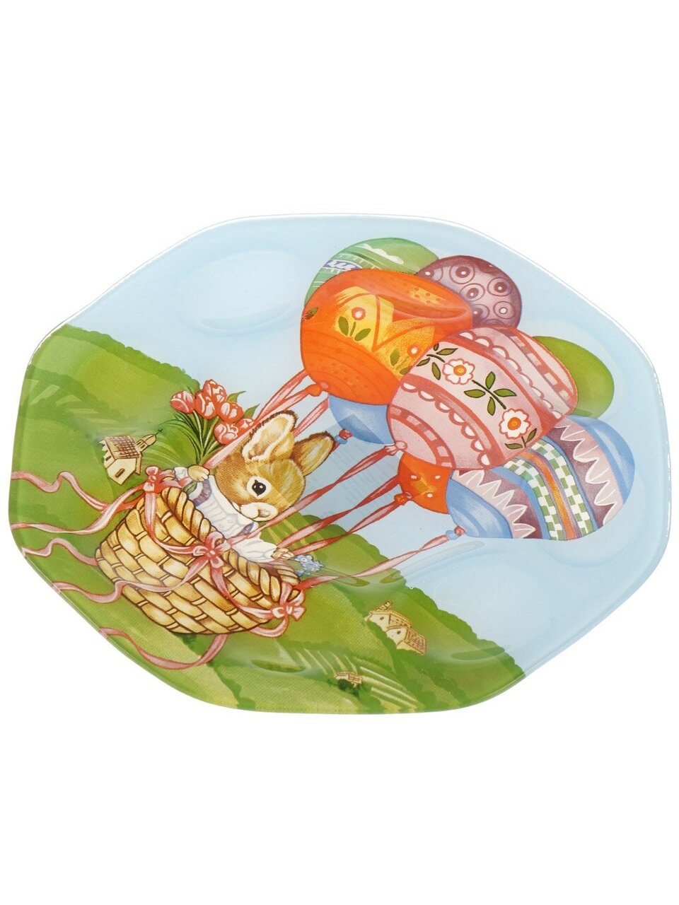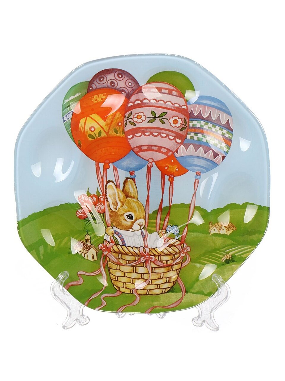Яркое стеклянное блюдо для яиц Daniks «Пасхальный зайчик» — стильный выбор для сервировки пасхального стола, диаметр 21 см, с разноцветным рисунком и бортиками.
