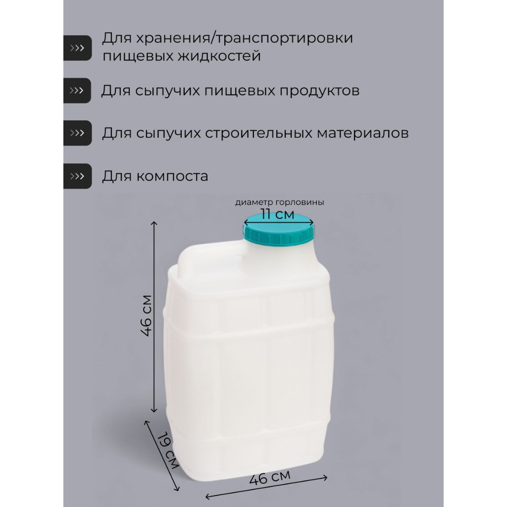 - универсальность: объем 20 литров подходит для хранения и транспортировки различных жидкостей, от воды до технических жидкостей;