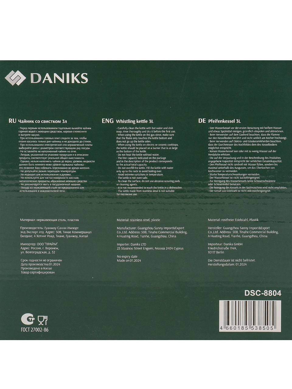 Чайник Daniks Emerald 3 л из матовой нержавеющей стали: универсальный выбор для индукции, газа и стеклокерамики. Безопасная ручка, стильный дизайн, выгодная цена.