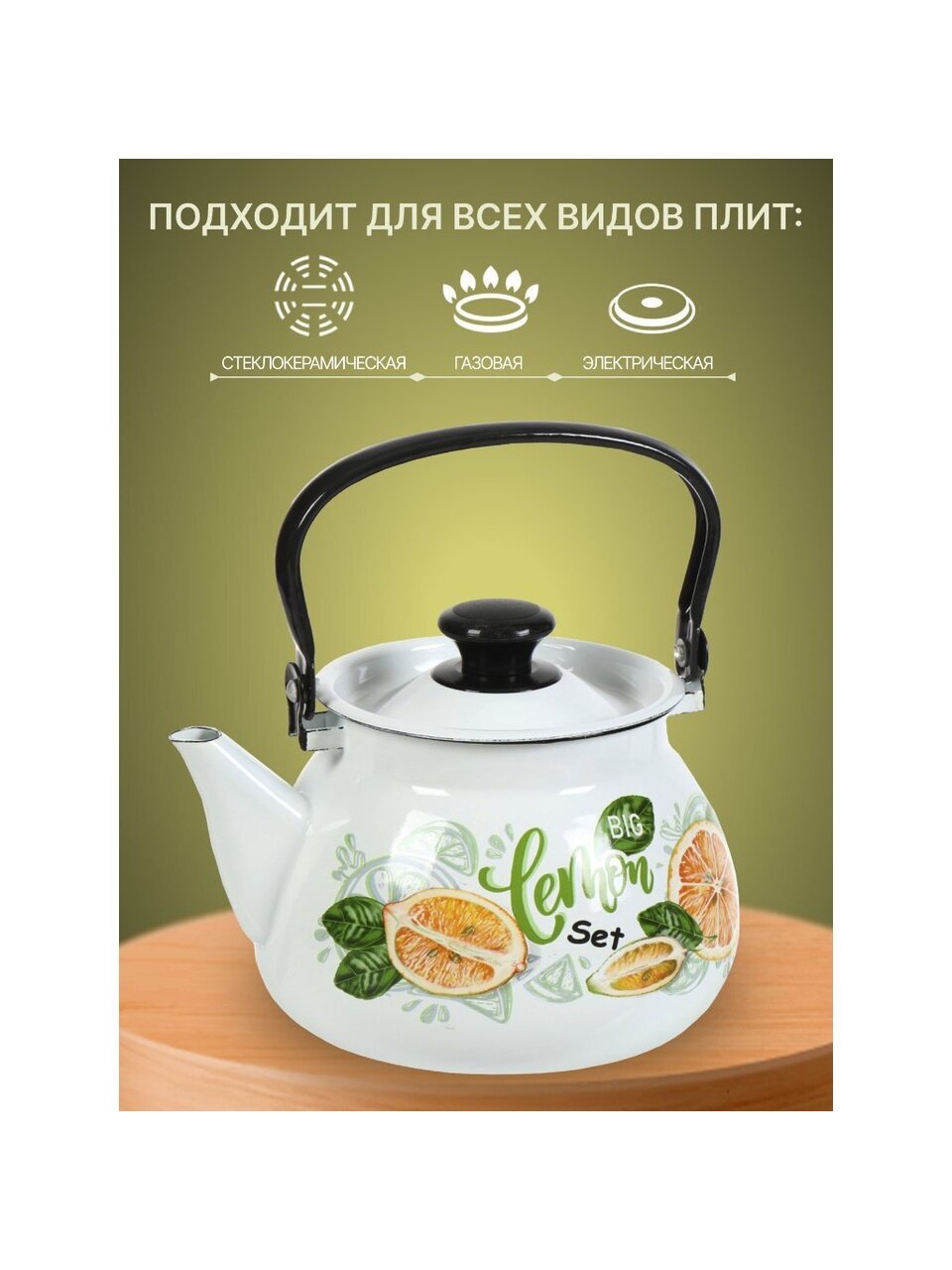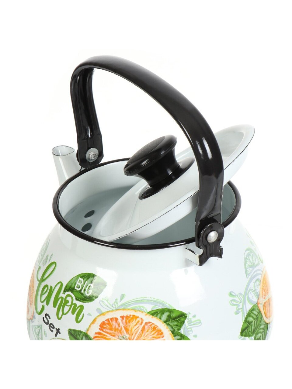 Чайник со свистком Керченский металлургический завод Лимонный сет - традиционный элемент кухни. Оформлен ярким рисунком, подходит для стеклокерамических, газовых и электрических плит.