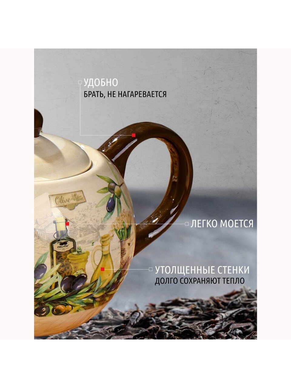 - Украшенные ярким рисунком стенки чайника, придают ему эстетичности на столе.