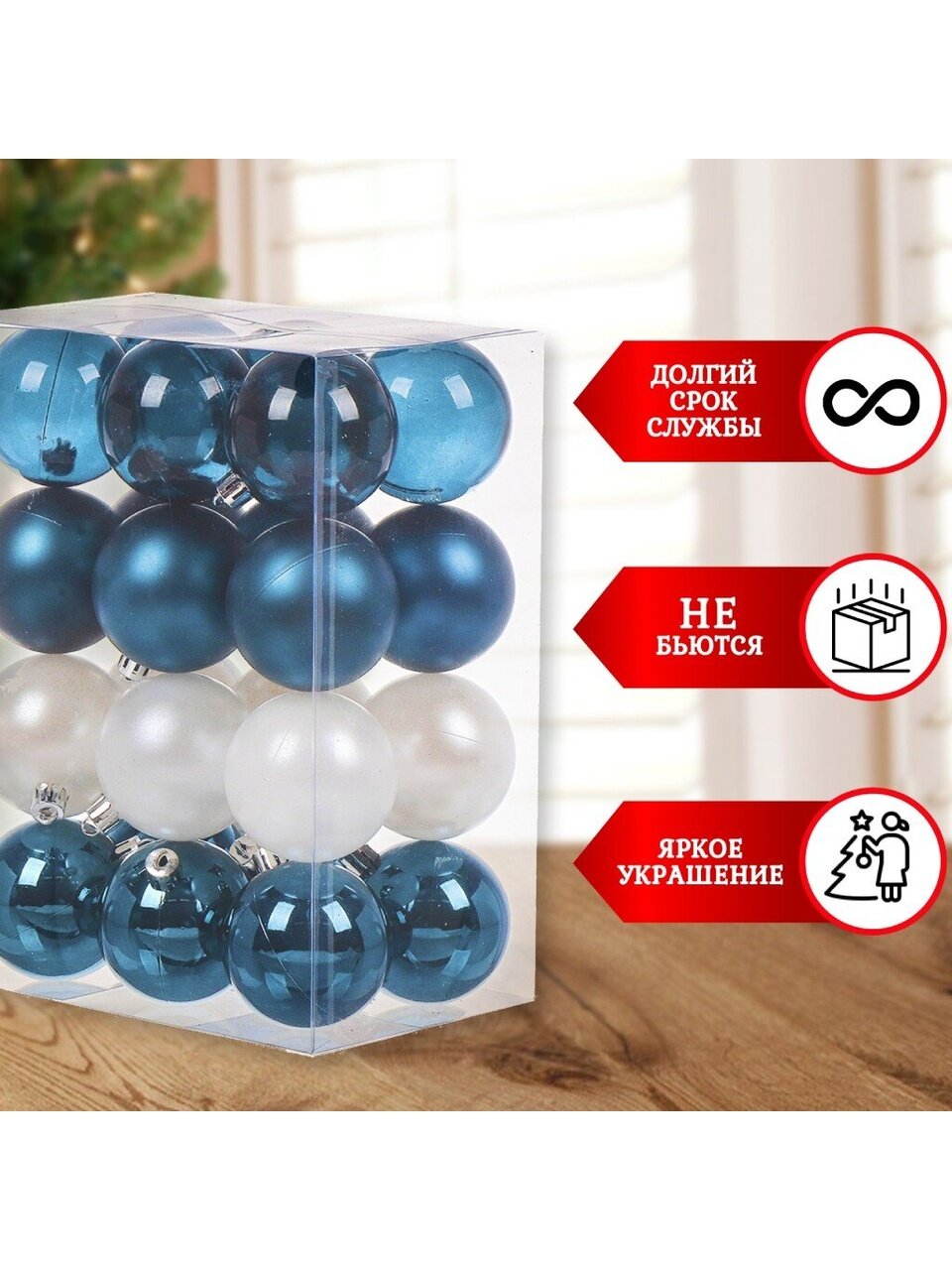 В наборе 24 шара диаметром 6 см, это компактный размер — украшения гармонично смотрятся как на стандартных, так и на небольших елках.