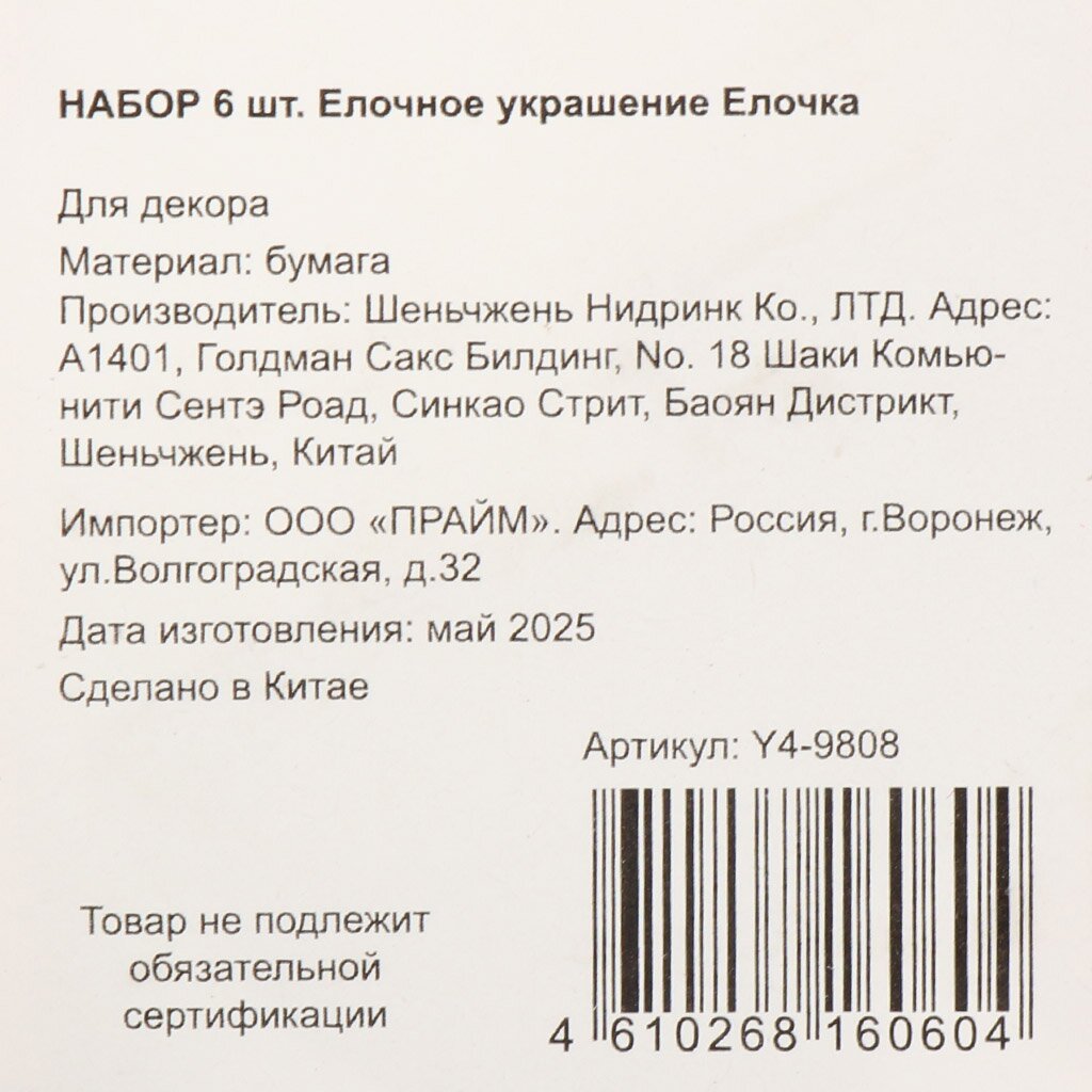 Какой материал у елочных украшений Елочка, Y4-9808?