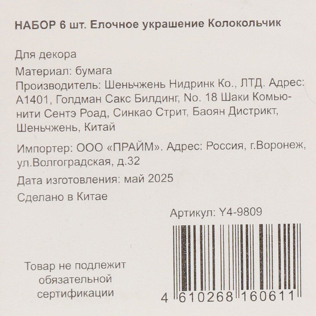 Вы можете приобрести «Елочное украшение Колокольчик, 6 шт, красный с блеском, бумага, Y4-9809» и другие товары в нашем интернет-магазине в Ельце по низким ценам и с бесплатным самовывозом.