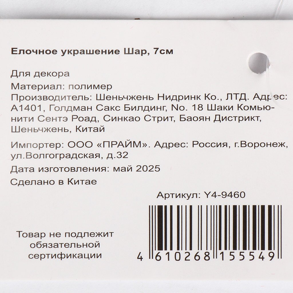 Диаметр шара — 7 см, тип крепления — на подвеске, что удобно для размещения на ветках любой толщины.