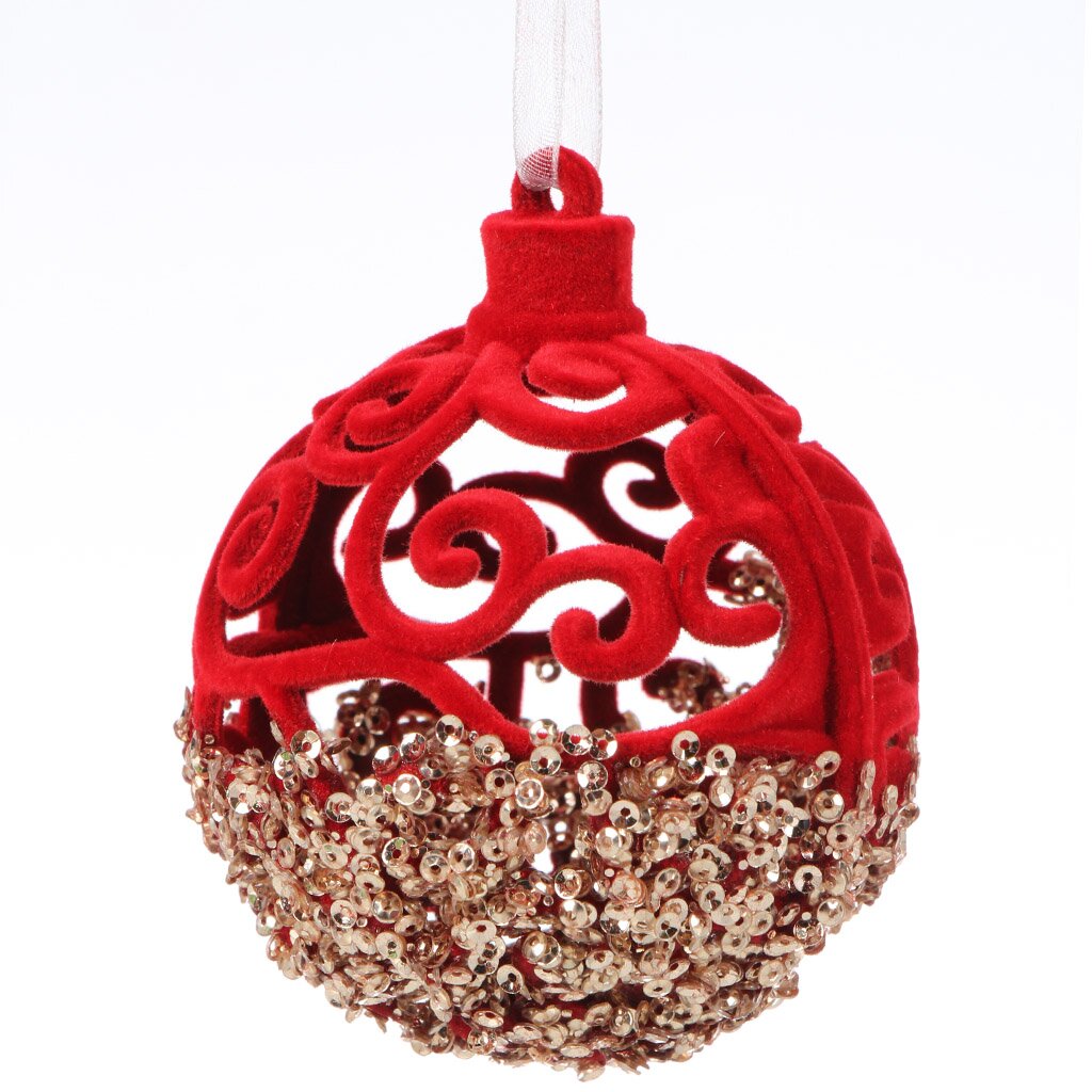 Елочное украшение из пластика с флоком и золотом — идеальный выбор для тех, кто ищет недорогое, но стильное решение для новогоднего декора. Благодаря прочному материалу шар не разобьется при падении, что особенно важно для семей с детьми и домашних животных. Красный цвет с золотым декором и пайетками придает елке праздничный вид, а средний размер (7 см) делает это украшение универсальным: оно гармонично смотрится как на больших, так и на компактных елках.