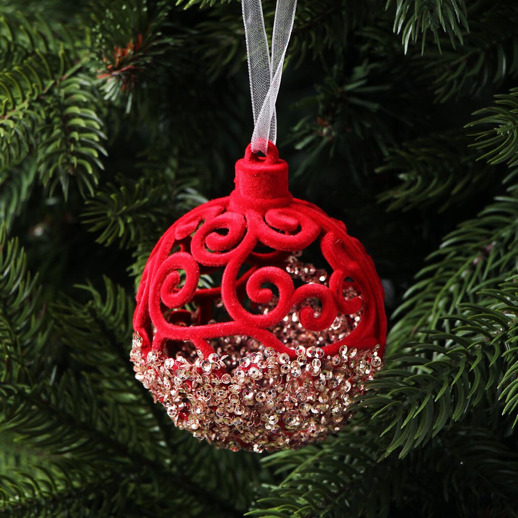 Украшение выполнено из прочного пластика с флоковым покрытием и блестками, не бьется при падении и подходит для уличного использования, в отличие от хрупких стеклянных шаров.