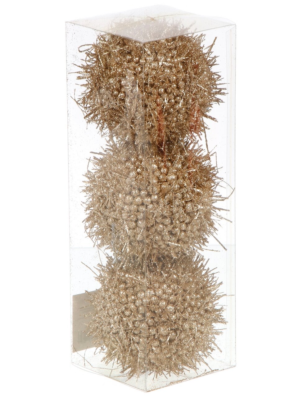 В комплекте 3 шара одинакового размера (8 см), цвет — шампань с мерцающим глиттером, что делает их универсальными для разных стилей оформления.