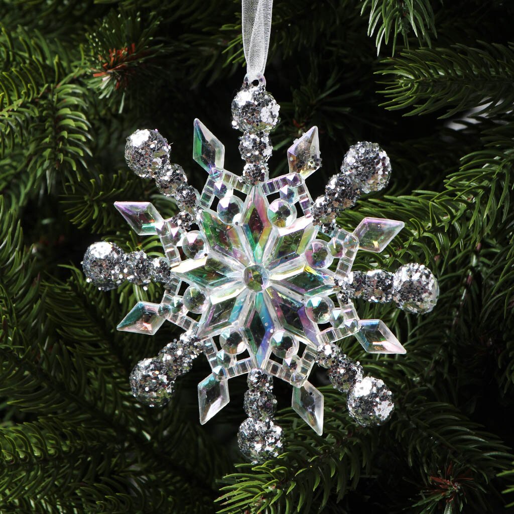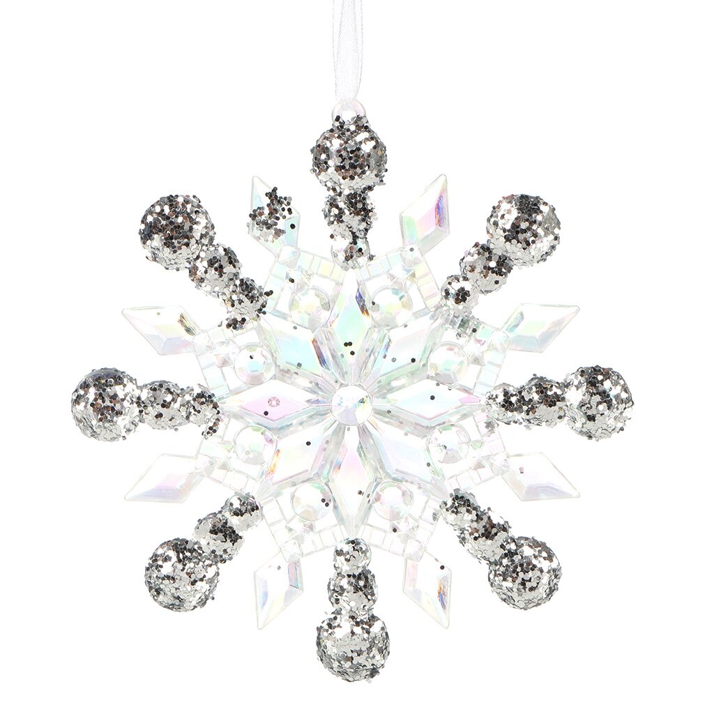 Елочное украшение «Снежинка» 12 см: стильный прозрачный пластик с серебром, небьющийся декор для дома и улицы. Легко выбрать, просто повесить.