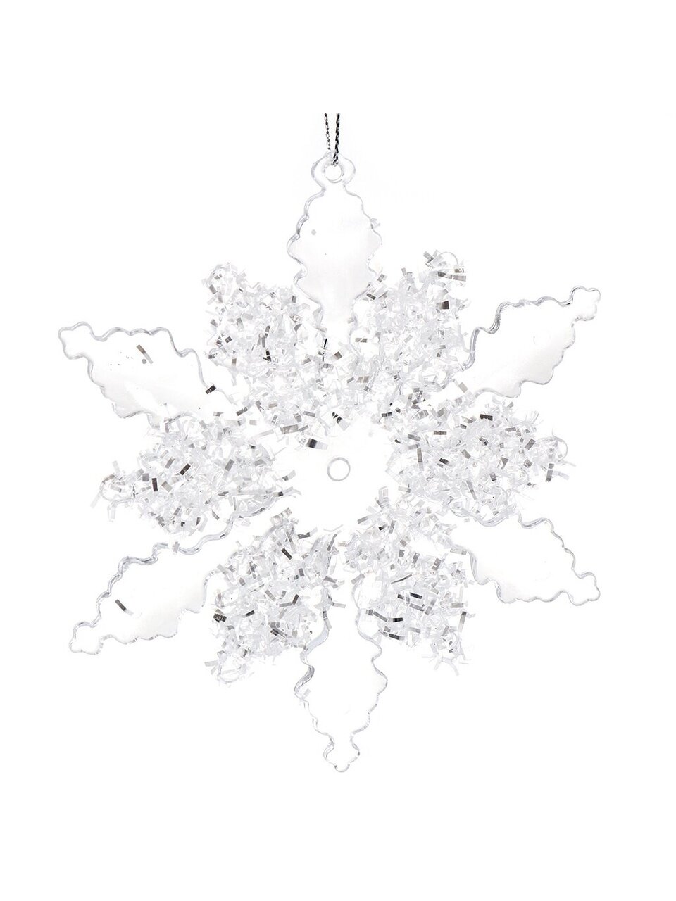 Прозрачная елочная снежинка 13 см — стильное небьющееся украшение для уличной и домашней елки. Безопасно для детей, эффектно сверкает на свету.