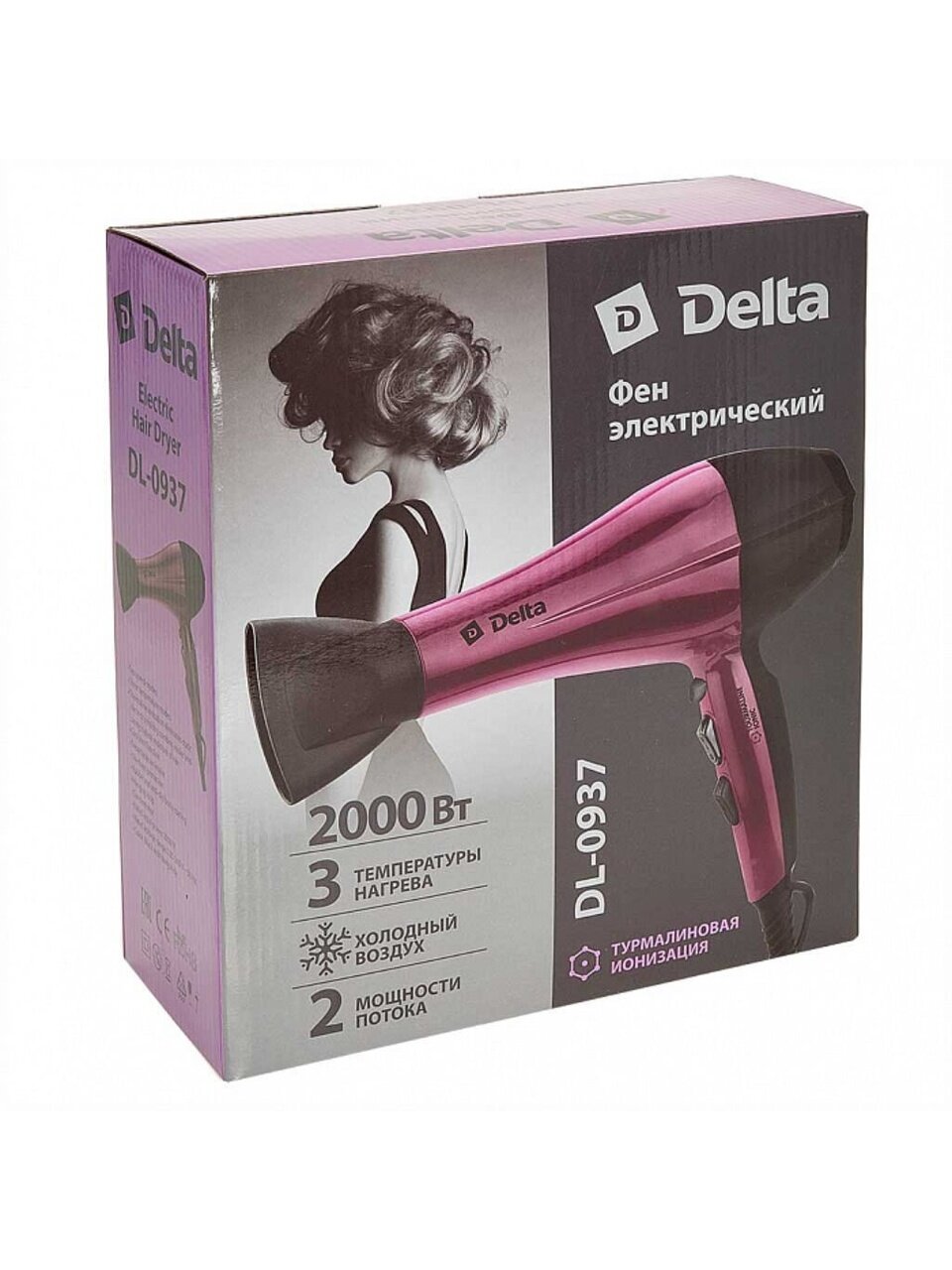 Фен Delta DL-0937 электрический предназначен для сушки и укладки волос в бытовых и аналогичных условиях. Турмалиновая ионизация снимает статическое электричество с волос, облегчая их расчесывание и сохраняя внутреннюю влагу.