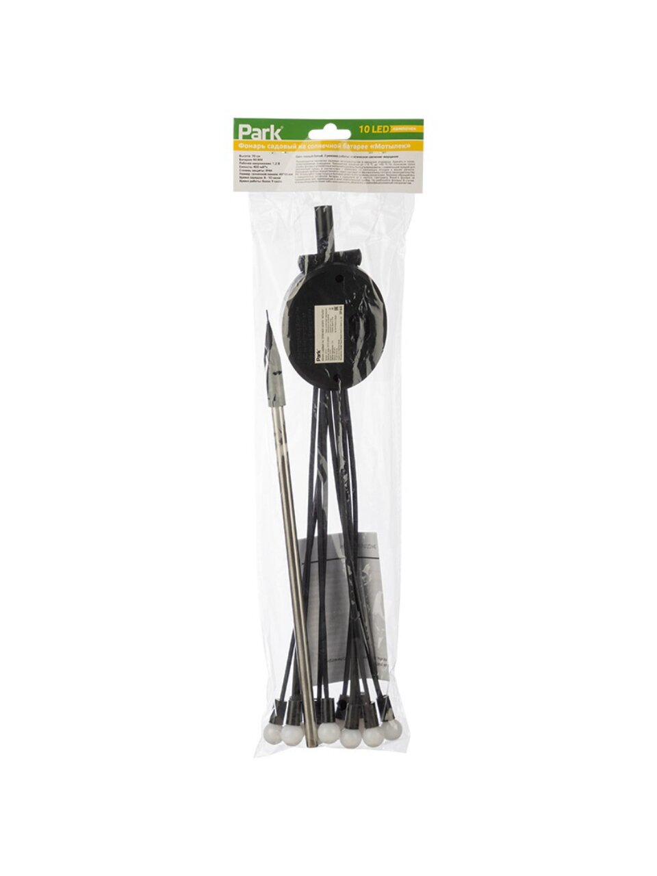Высота — 67 см, цвет корпуса — чёрный, встроенный LED-светильник на 10 лампочек, степень защиты IP44 (от дождя и пыли), питание от солнечной батареи, гарантия 12 месяцев.