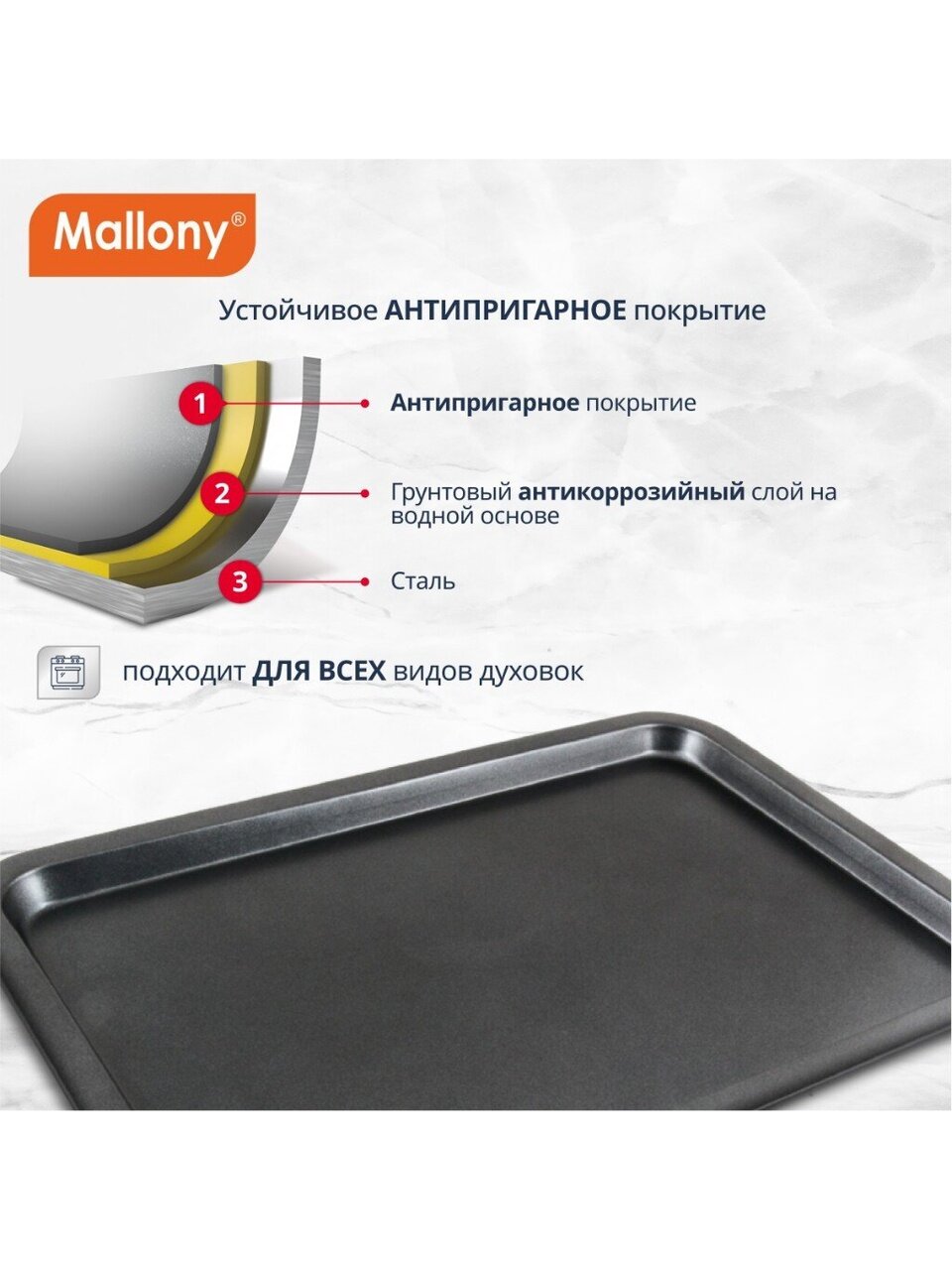 Прямоугольная форма для запекания Mallony 46,5×32,7×2,5 см: антипригарное покрытие, прочная сталь, идеальна для мяса и курицы дома и на даче.