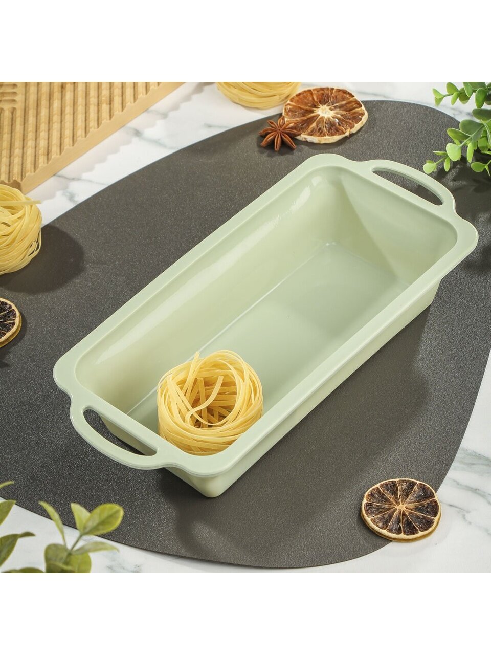 Форма для запекания Daniks Dust — это современный выбор для тех, кто ищет практичную и долговечную посуду для духовки. Благодаря силиконовому основанию с металлическим каркасом, изделие сохраняет стабильную форму, не прогибается под весом теста или начинки. Фисташковый цвет гармонично впишется в любую кухню, а универсальный размер 31.5х14.6 см позволяет готовить хлеб, пироги, паштеты и даже порционные запеканки.