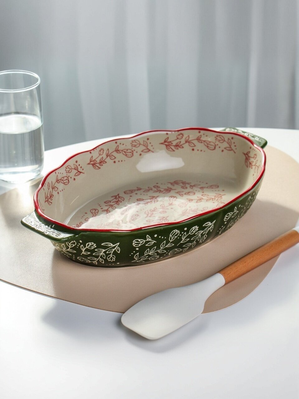 Уникальный декор «Зеленые веточки» выделяет эту форму среди аналогов — она не только функциональна, но и эстетична для подачи. В отличие от металлических или стеклянных форм, керамика лучше сохраняет температуру и не взаимодействует с продуктами. Если интересует, чем отличается керамическая посуда от других, — она долговечна, устойчива к царапинам, не впитывает запахи.