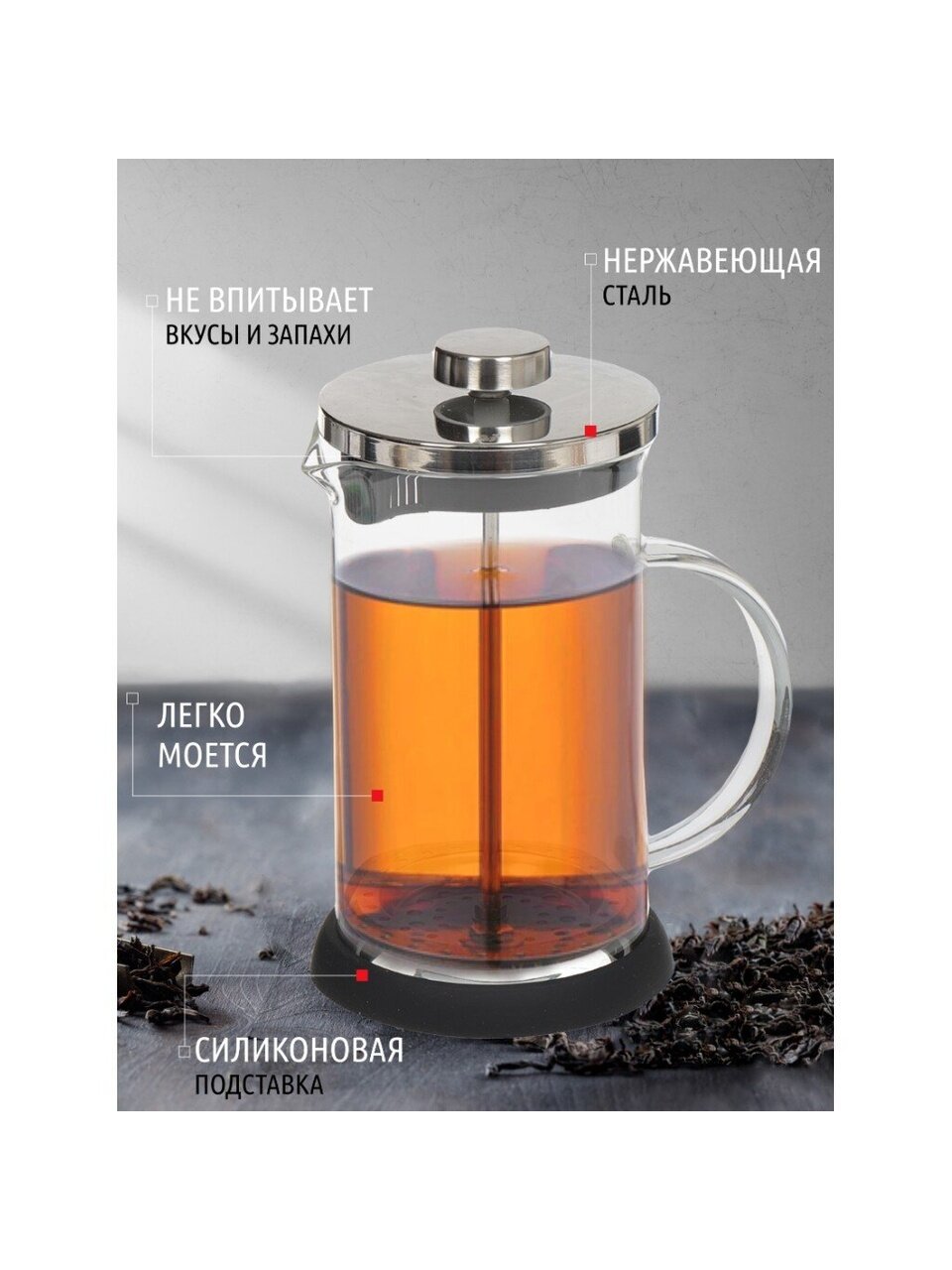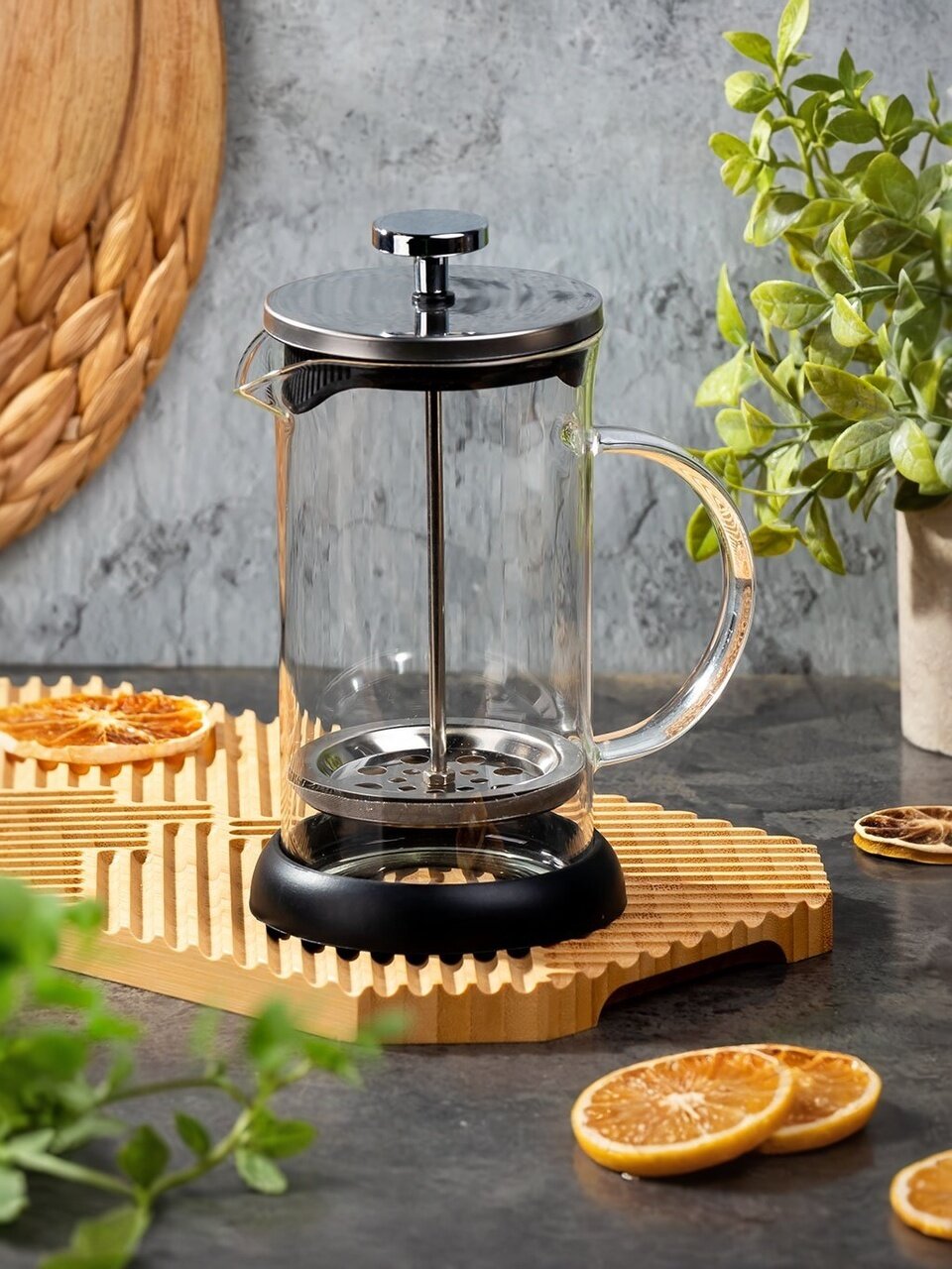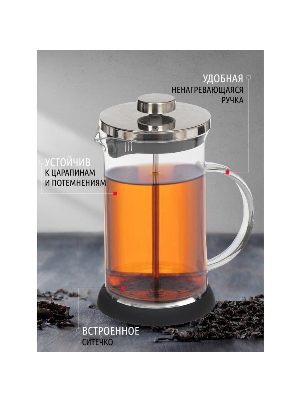 Френч-пресс Daniks прекрасно подойдет для заваривания кофе, чая, травяных настоев и даже какао. Вы можете регулировать время приготовления напитка, а также комбинировать его с различными наполнителями (специи, травы, фрукты, ягоды). Заваривание кофе во френч-прессе позволяет раскрыть настоящий вкус и аромат этого напитка, ощутить все нюансы и оттенки изысканных сортов кофе. Френч-пресс выполнен из упрочненного стекла, которое сохраняет вкус и запах напитков. Металлический сетчатый фильтр обеспечивает высокое качество фильтрации напитка и позволяет использовать ингредиенты мелкого помола. Съемная силиконовая основа защищает кухонные поверхности от воздействия высокой температуры во время приготовления напитков. При заваривании вам не придется использовать дополнительно подставку под горячее.