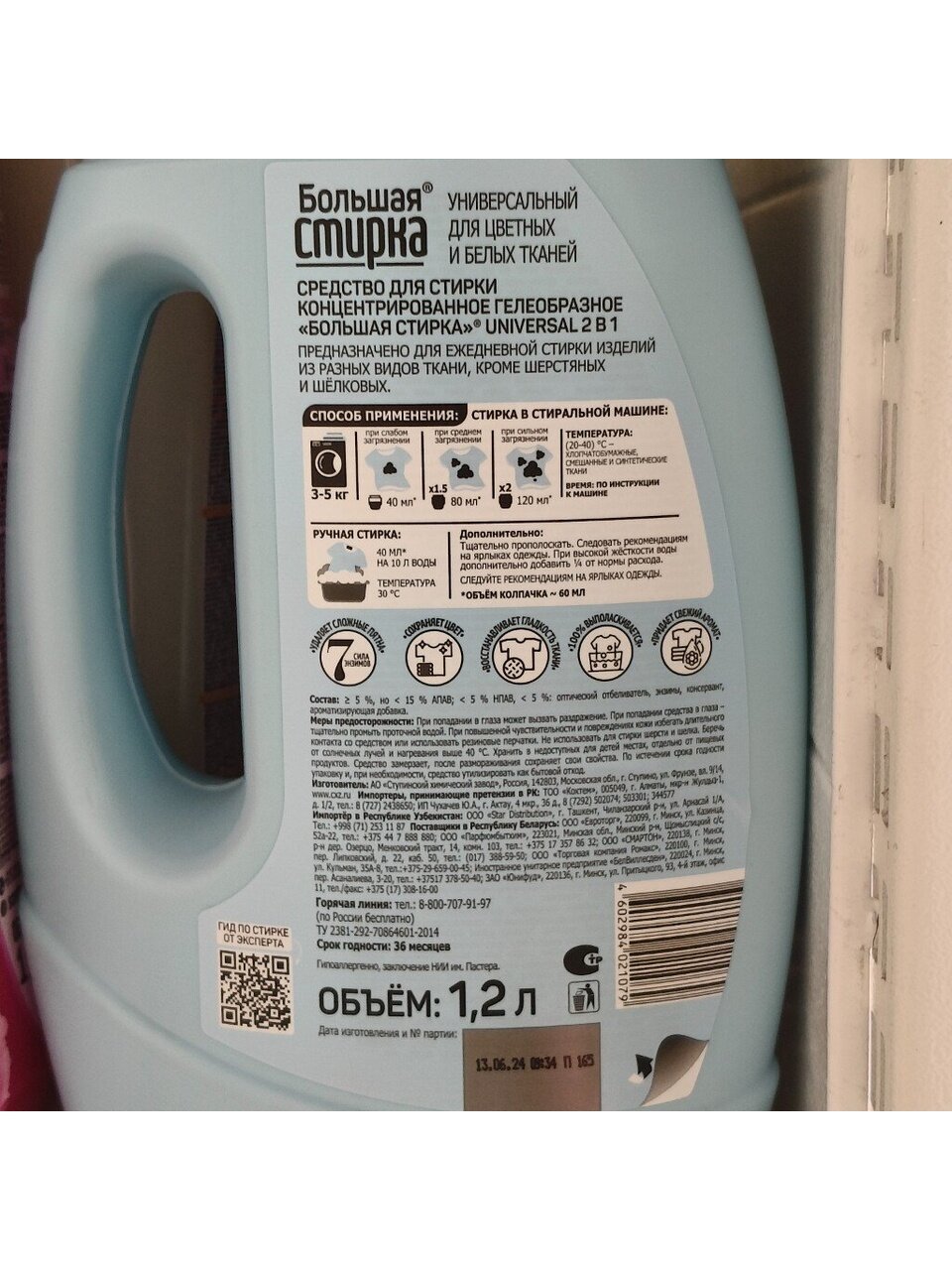Гипоаллергенный гель для стирки всех видов тканей "Большая стирка" - эффективно удаляет загрязнения, устраняет неприятные запахи, дезодорирует одежду, бережно ухаживает за волокнами ткани, поэтому даже после многократных стирок вещи сохраняют цвет и форму.