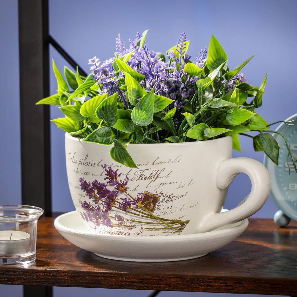 Креативный горшок из керамики выполнен в виде чашки с блюдцем. Оригинальная форма и высокая функциональность рождают интересное сочетание, которое понравится поклонникам нестандартных решений и практичности одновременно. А вместительный поддон поможет не беспокоиться о вылившейся на подоконник грязной воде.