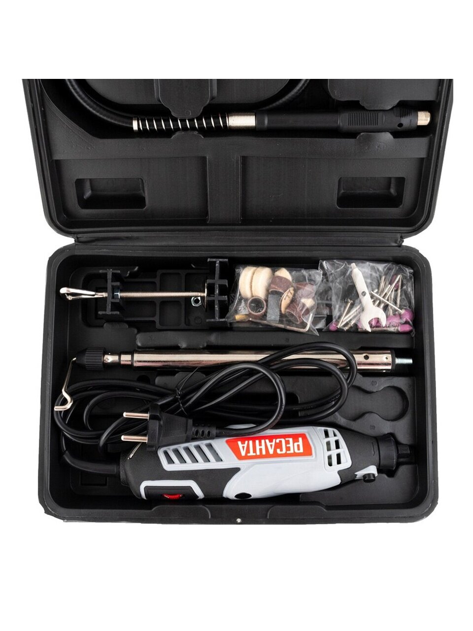 - Гибкий вал позволяет более комфортно работать с мелкими деталями, есть стойка для удобного хранения.