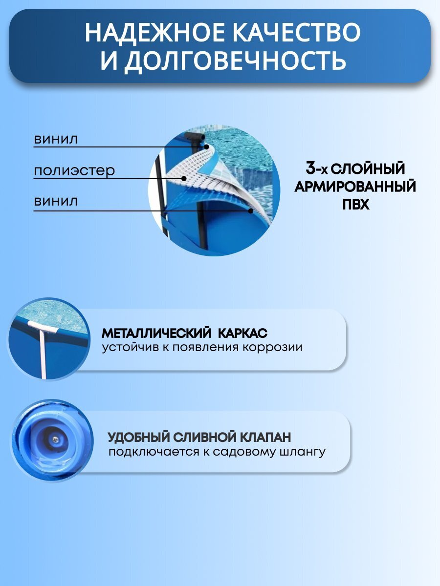 Бассейн для дачи Bestway Steel Pro - это не только возможность охладиться в летний зной, но и отличная альтернатива поездкам на пляж. Каркасный бассейн позволяет насладиться водными процедурами в любое время, не покидая пределов участка. Установка не требует специальных навыков.