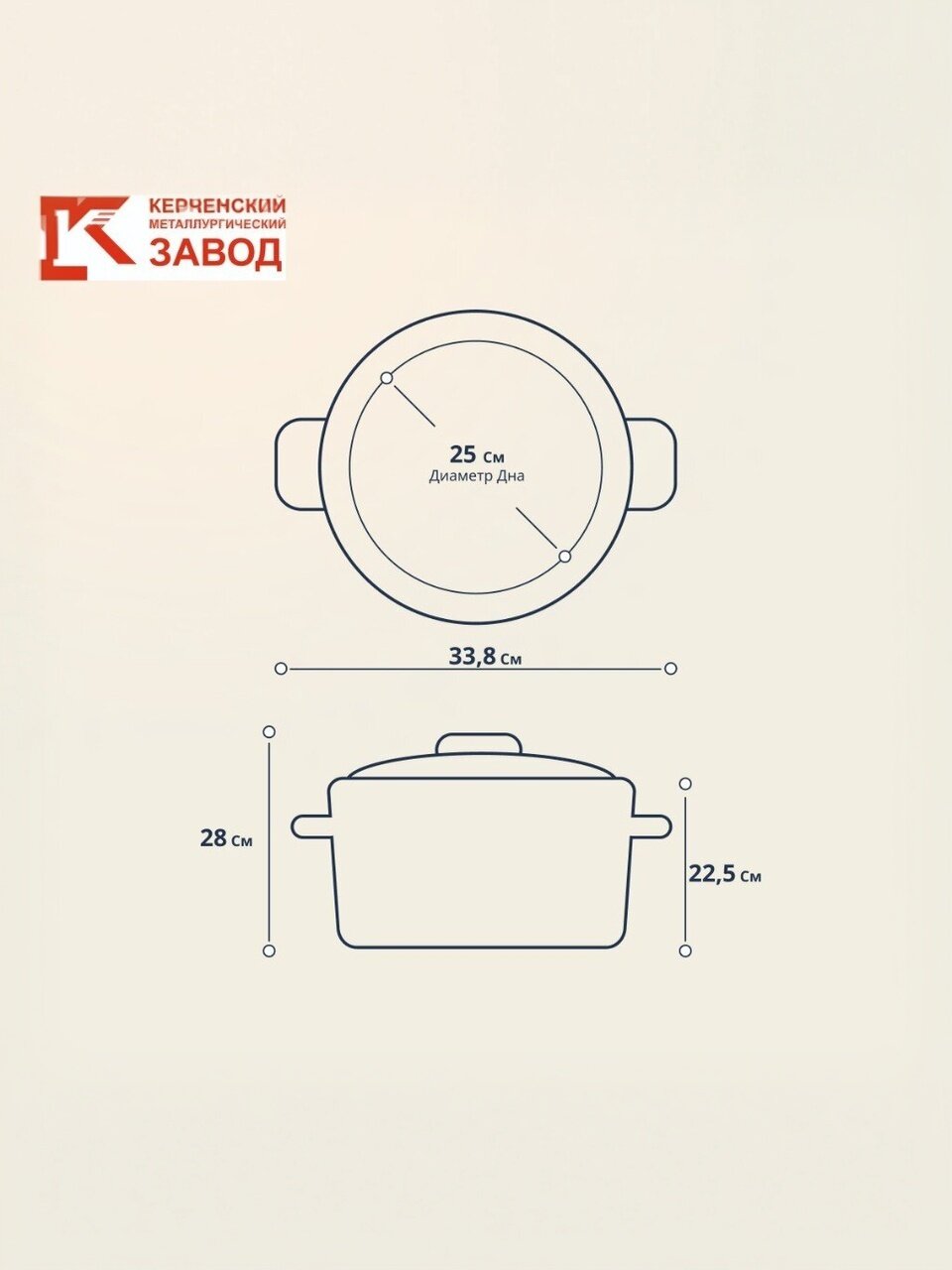 Диаметр кастрюли и крышки — 25 см, высота с крышкой — 28 см, без крышки — 22,5 см. Объём — 10 литров.