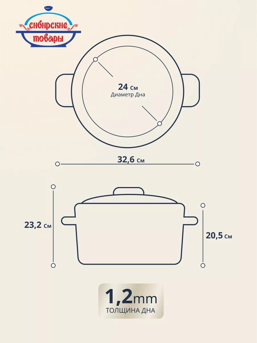 Объём — 9 литров, диаметр дна и крышки — 24 см, высота с крышкой — 23,2 см, вес — 1,58 кг. Толщина дна — 1,2 мм, форма цилиндрическая.