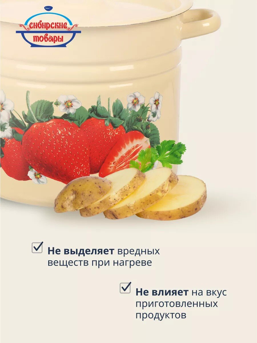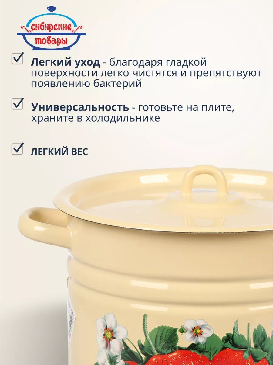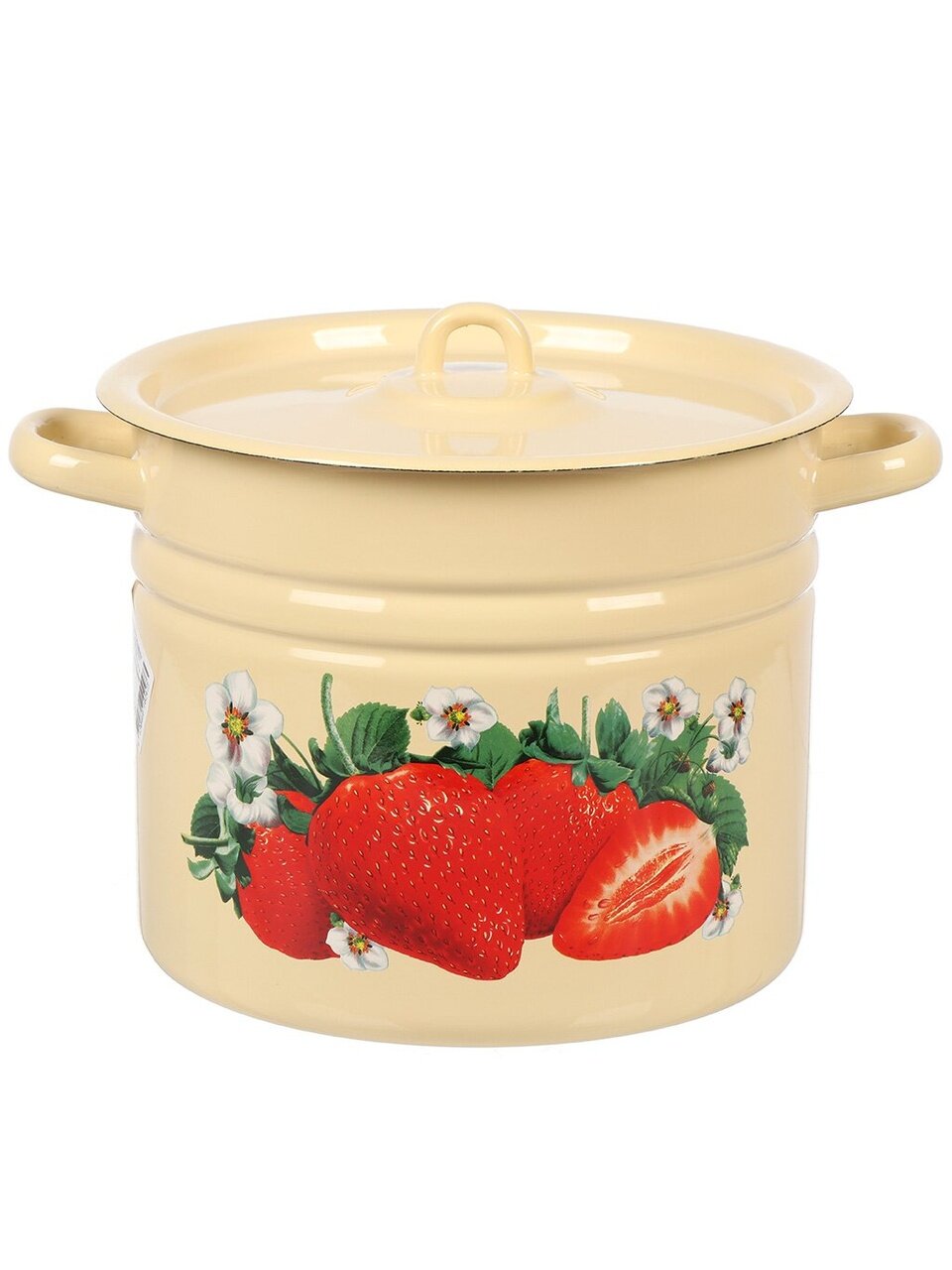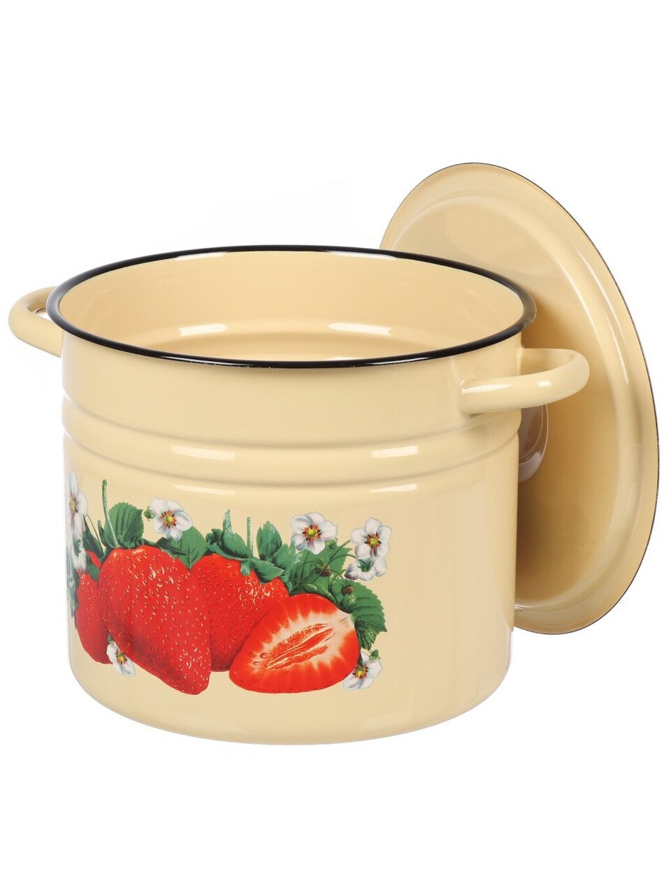 Кастрюля эмалированная 9 л «Клубника садовая» — идеальное решение для большой семьи: безопасное хранение, быстрое приготовление, универсальность для кухни и дачи.