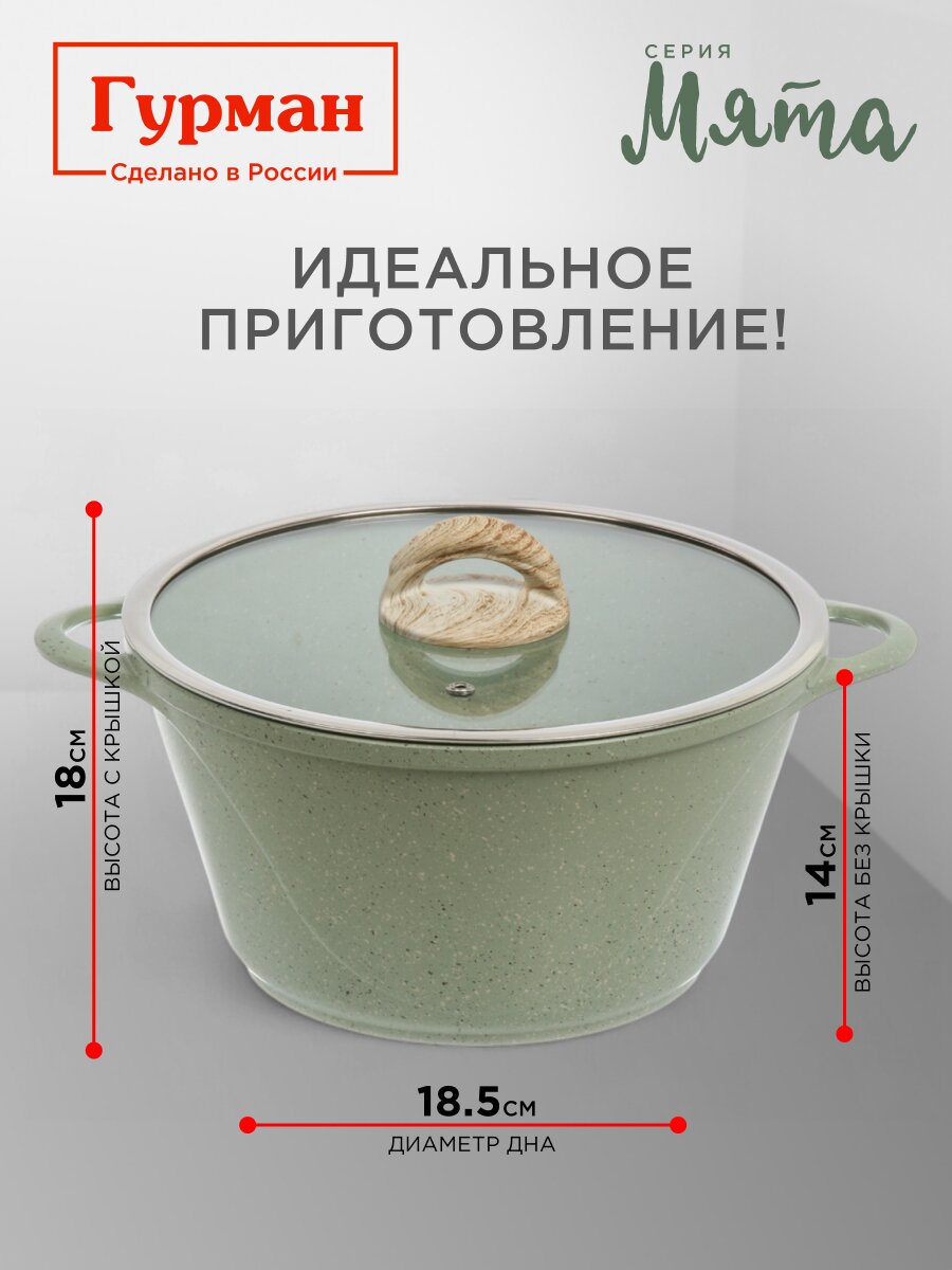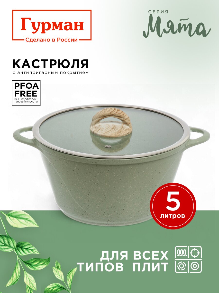 Выбирайте модели с толстым дном и пометкой «для индукции». Кастрюля Гурман Мята подходит для всех типов плит, включая индукционные, благодаря специальному дну толщиной 5,5 мм.