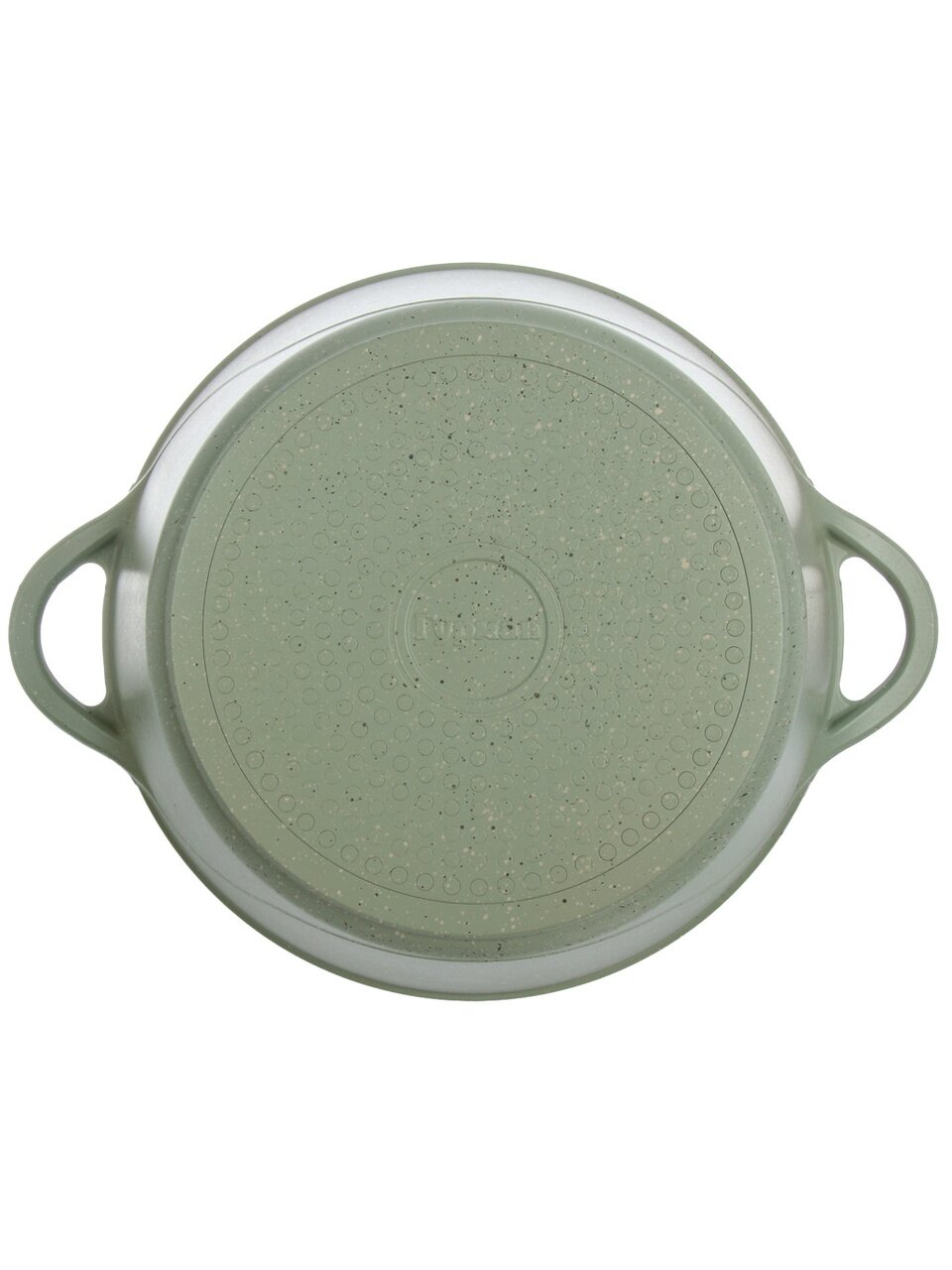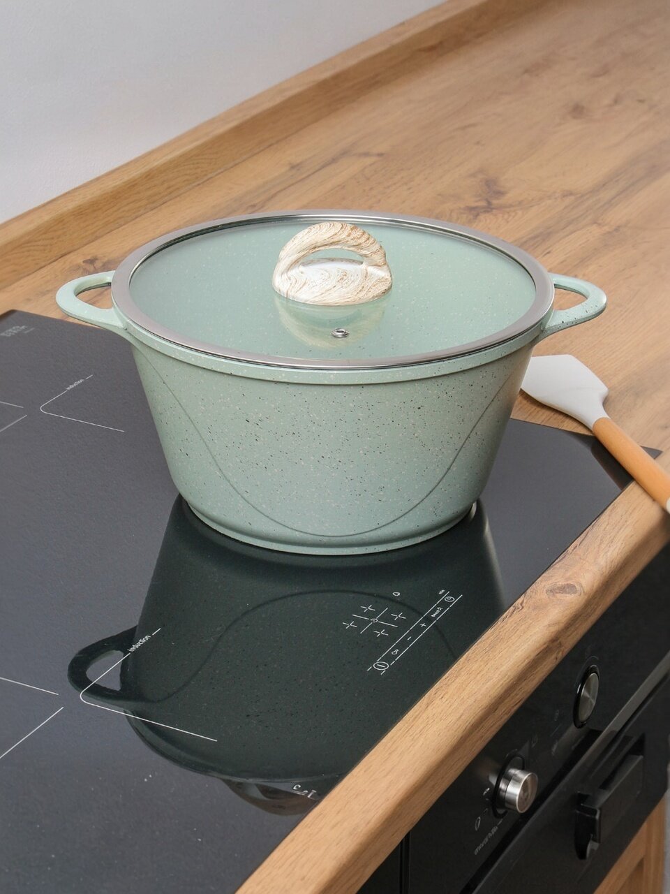 Кастрюля Гурман Мята 5 л — это современное решение для тех, кто ищет, какую кастрюлю выбрать для повседневной готовки. Прочный алюминиевый корпус с толстым дном (5,5 мм) обеспечивает быстрый и равномерный нагрев на любых плитах, включая индукционные. Гранитное антипригарное покрытие позволяет готовить без масла и легко отмывать посуду после использования, что особенно важно для семей с детьми или тем, кто ценит время. Стеклянная крышка с выпускным клапаном сохраняет аромат блюд и предотвращает выкипание, а мятный цвет добавляет свежести интерьеру кухни.