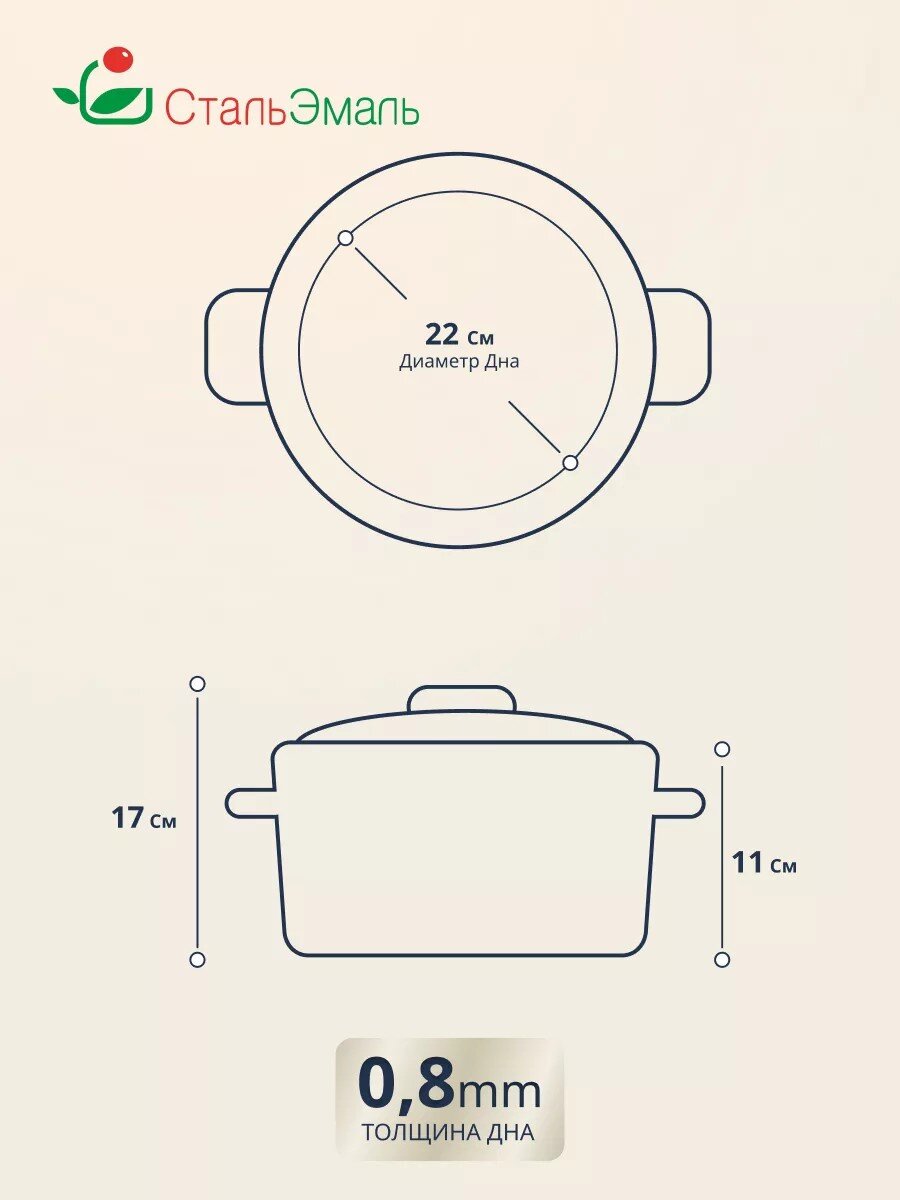 - Прочная эмалированная сталь: объем 4 л, диаметр 22 см, толщина дна 0,8 мм — оптимально для ежедневного использования