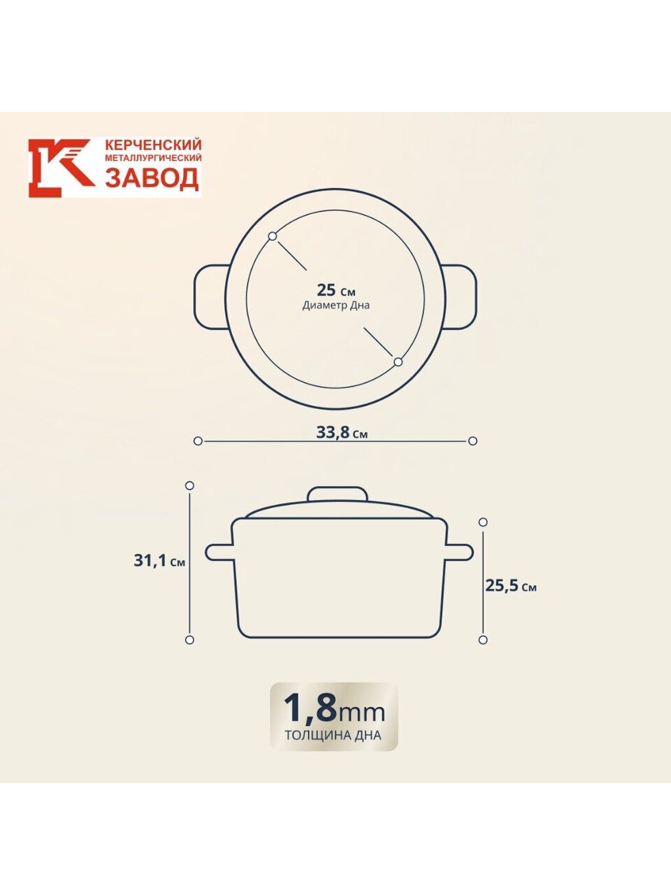 Диаметр и диаметр дна — 25 см, высота с крышкой — 31,1 см, без крышки — 25,5 см. Вес изделия — 2,2 кг, толщина дна — 1,8 мм.
