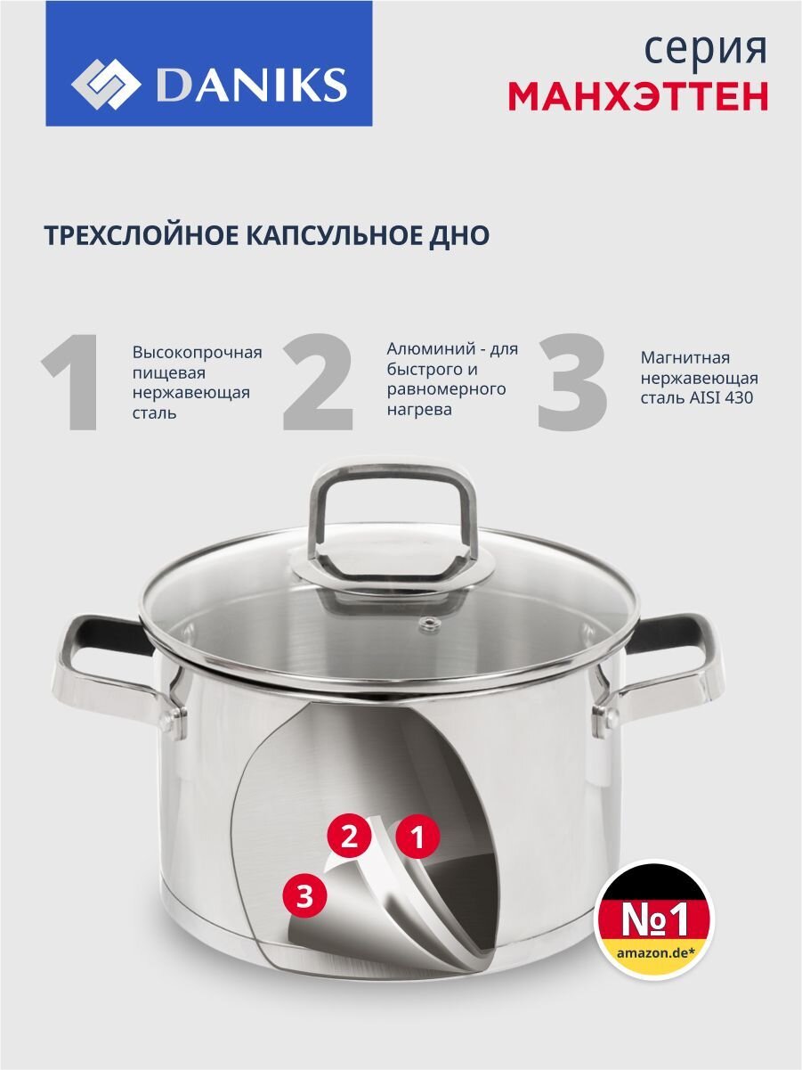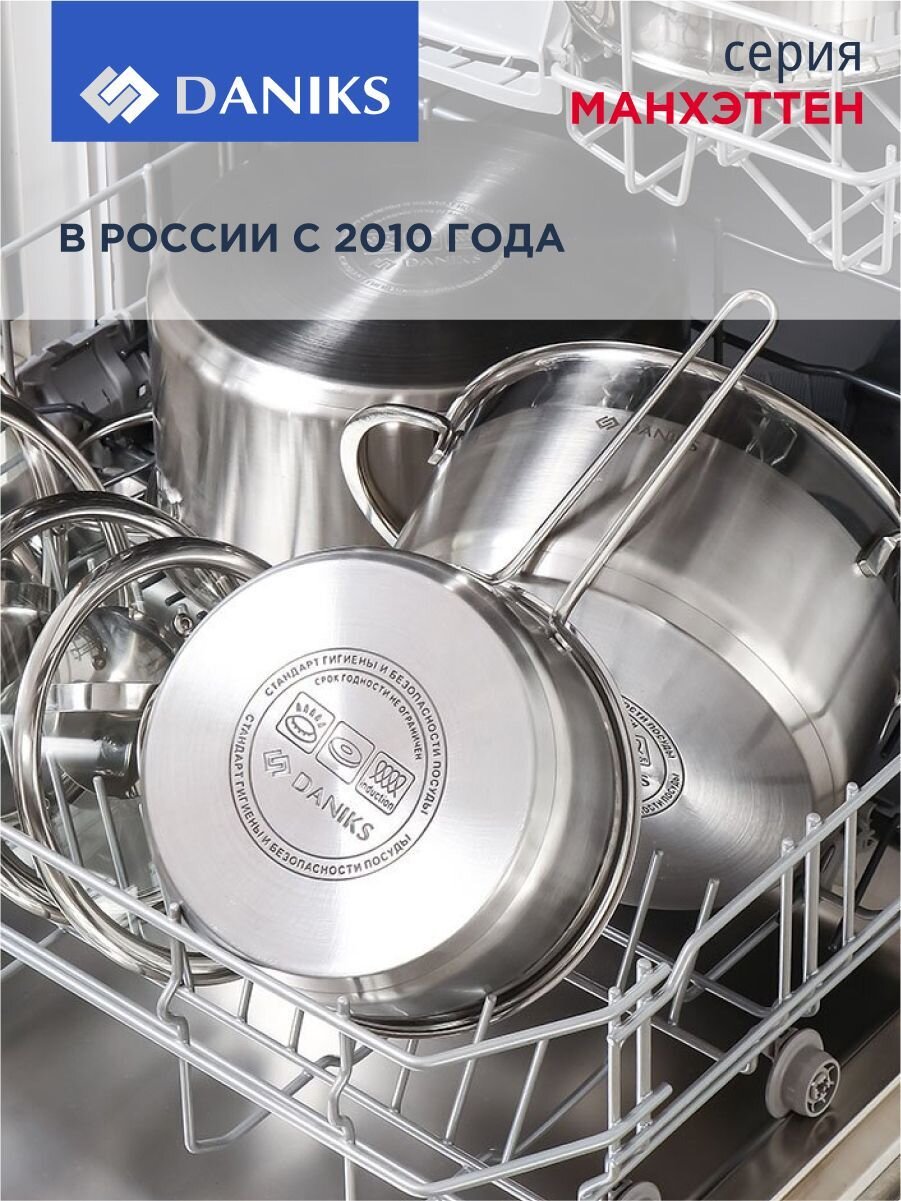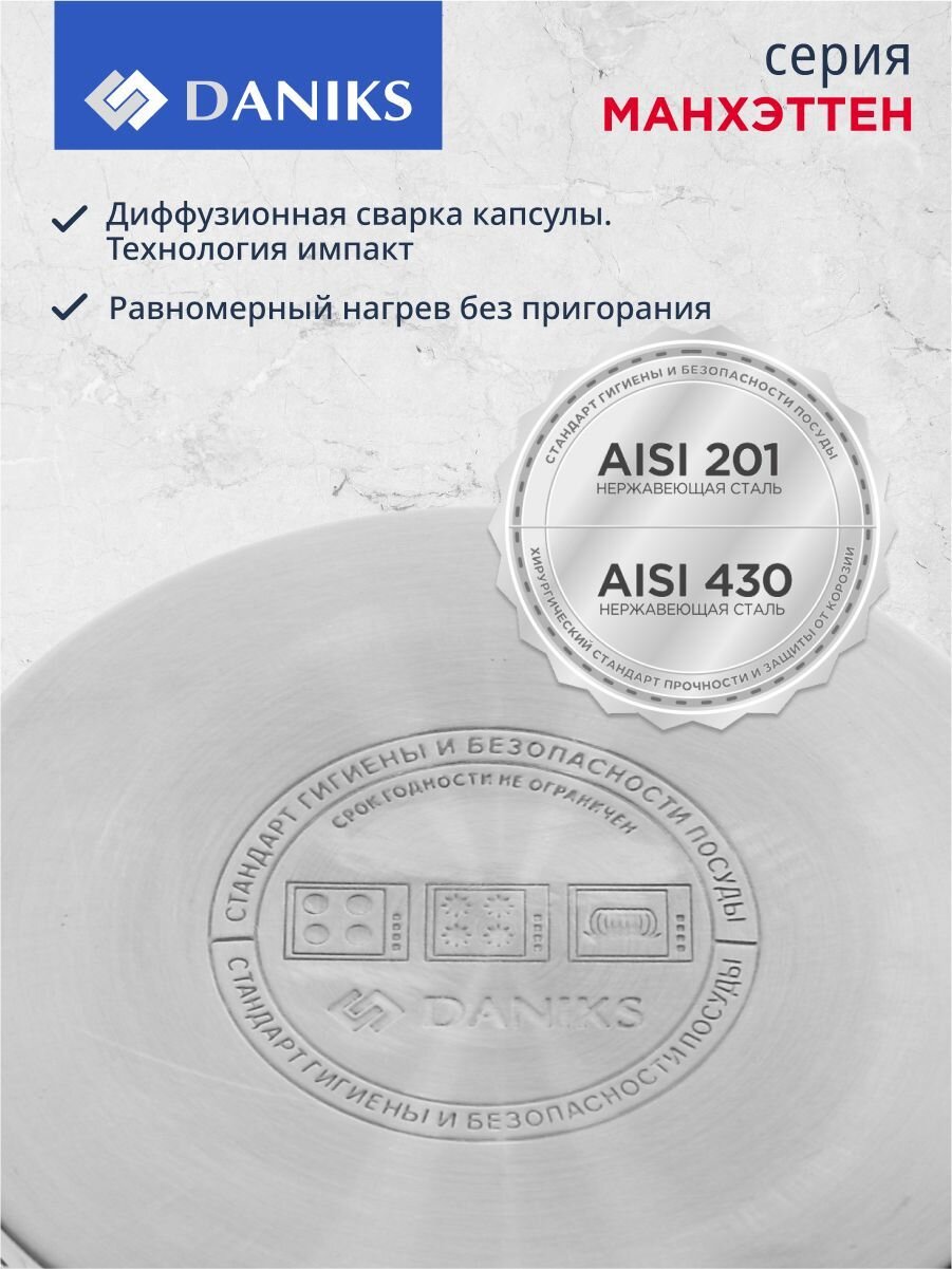 Кастрюля из нержавеющей стали Daniks Манхэттен 4.75 л: оптимальный объём, стеклянная крышка, подходит для индукции и любых плит. Идеальный выбор для семьи.