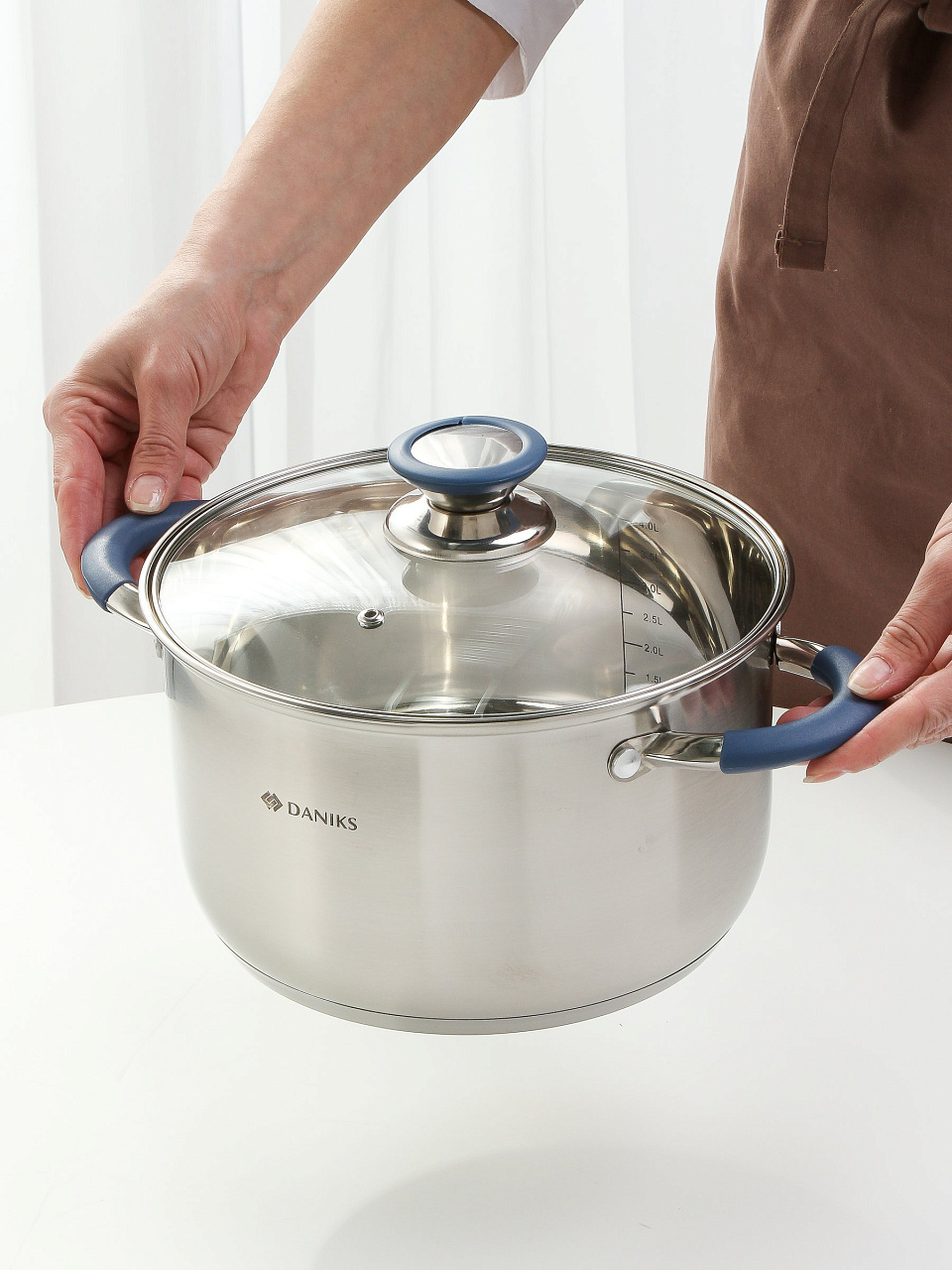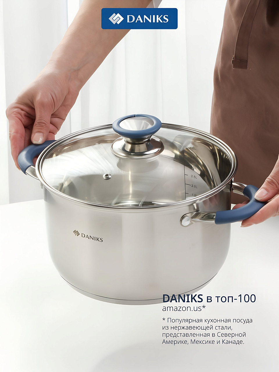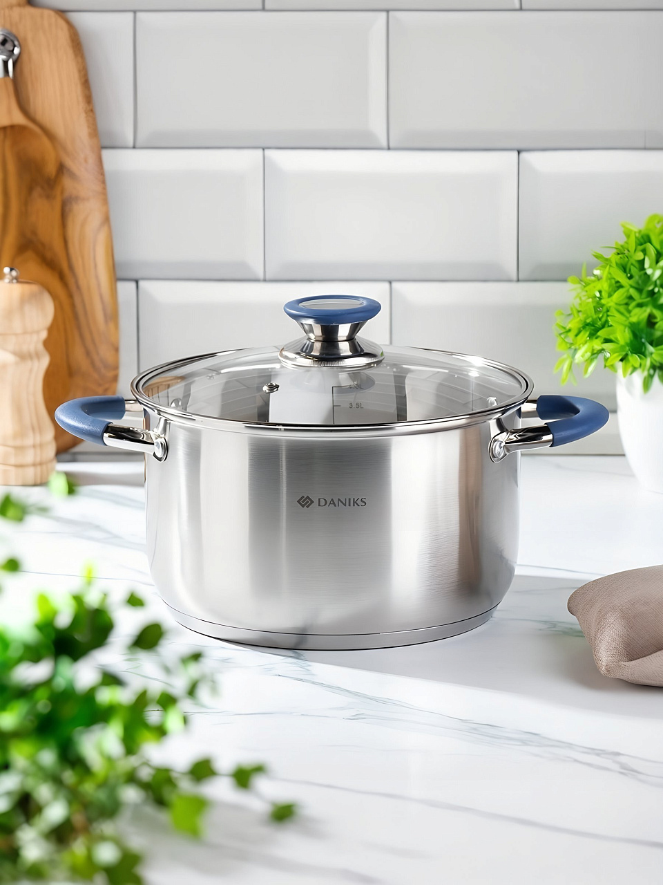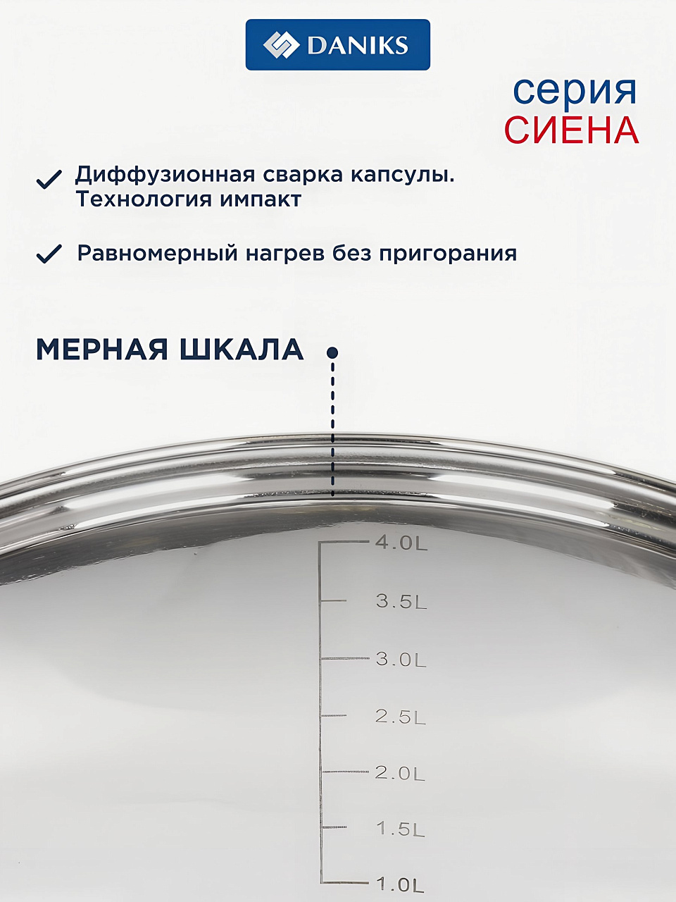Часто спрашивают: "Как выбрать кастрюлю для индукционной плиты?" или "Что лучше для дачи — нержавейка или эмаль?" Данную модель выбирают за долговечность, универсальность и отсутствие антипригарного и эмалированного покрытия, что исключает сколы и царапины при интенсивном использовании. В отличие от аналогов из алюминия, эта кастрюля не окисляется, легко моется, не впитывает запахи, а мерная шкала облегчает дозировку ингредиентов. Подходит для подарка — современный дизайн и бренд Daniks подчеркивают статус владельца.