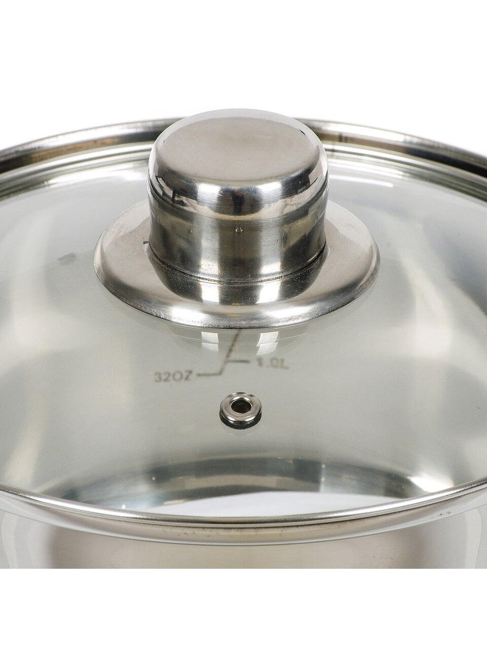 - Корпус из прочной нержавеющей стали 18 см, стеклянная крышка, легкий вес (0,5 кг), срок службы — до 10 лет