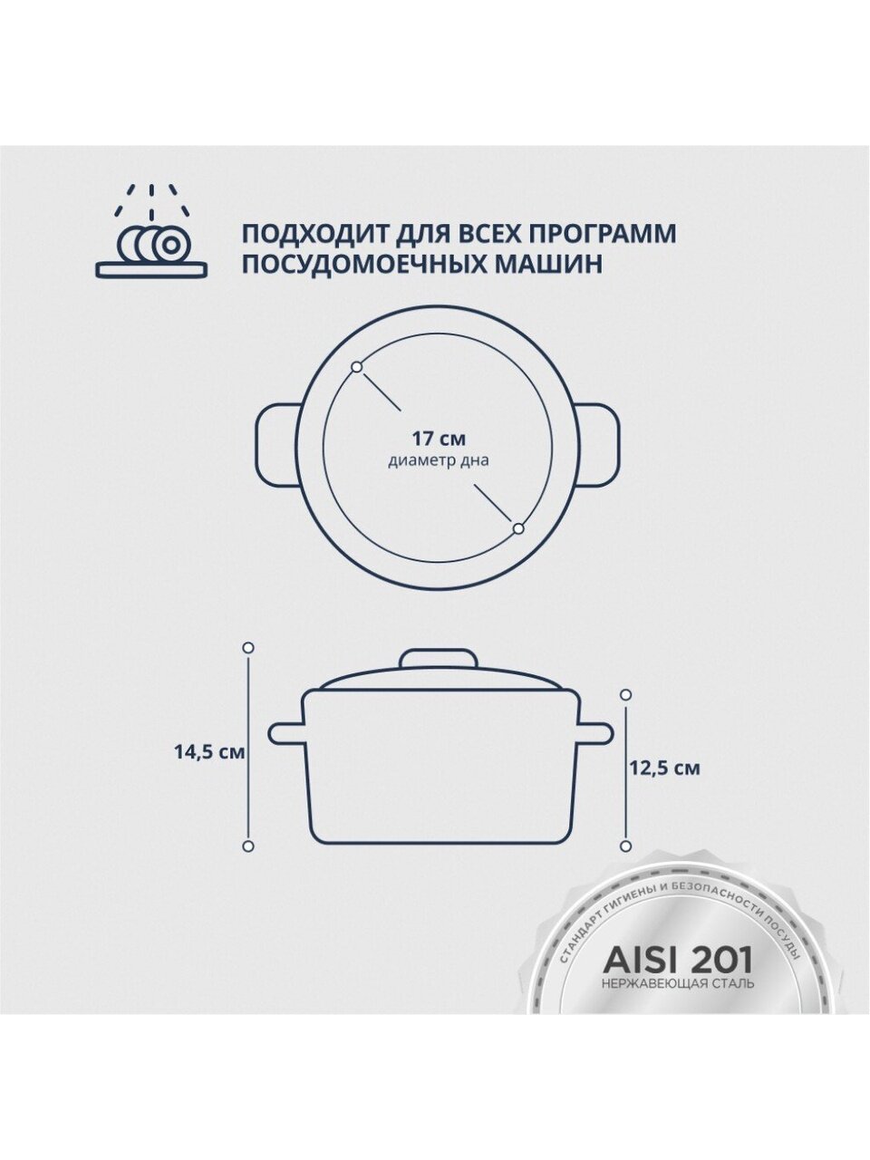 Диаметр кастрюли — 20 см, диаметр дна — 17 см, высота с крышкой — 14,5 см, без крышки — 12,5 см.