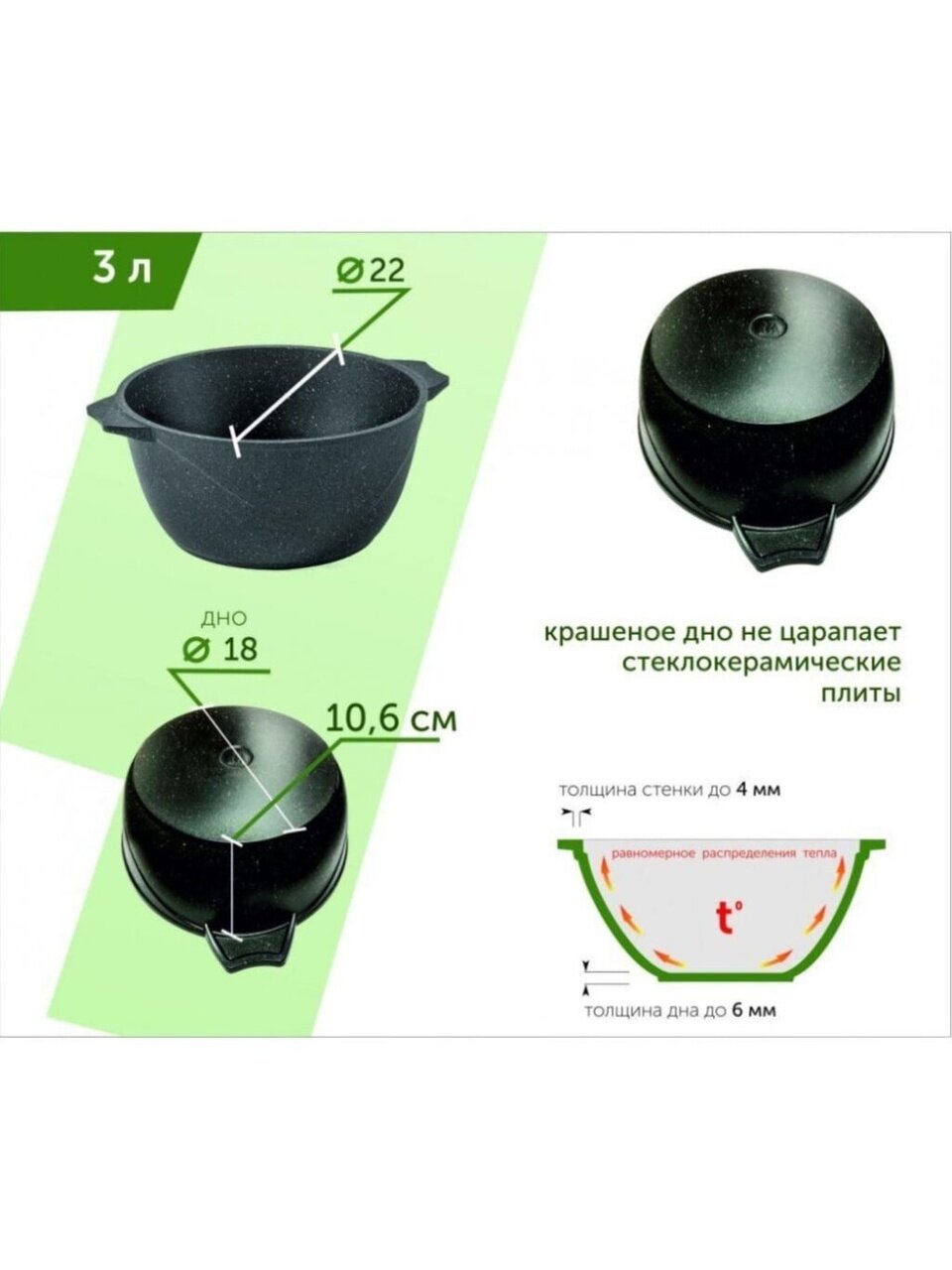 Диаметр кастрюли — 22 см, высота без крышки — 10,6 см, с крышкой — 19,5 см. Объем — 3 литра, диаметр дна — 18 см.