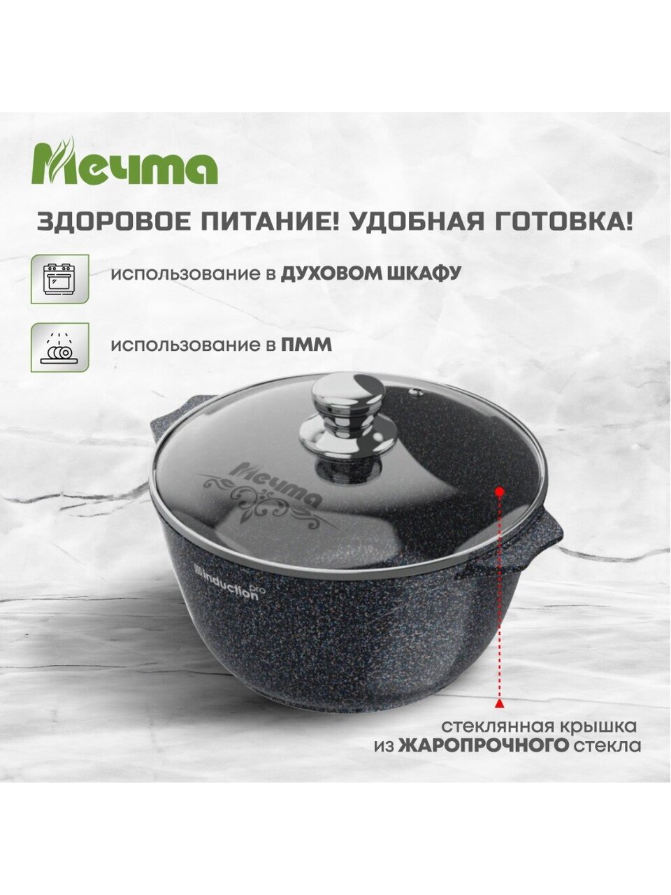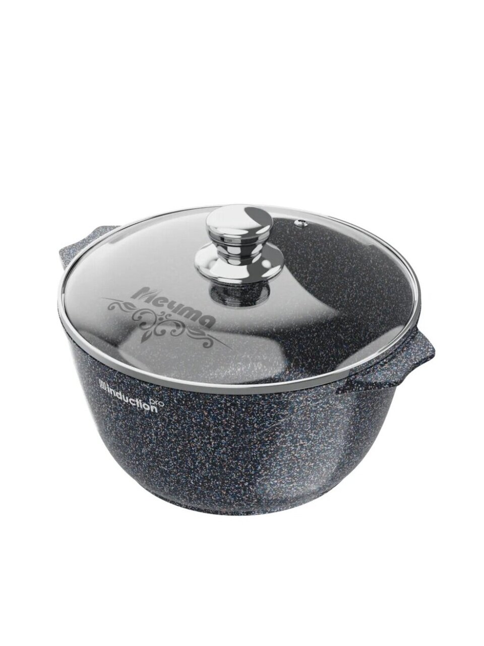 Кастрюля Мечта Гранит star Induction — это современное решение для тех, кто ищет, какую кастрюлю выбрать для индукционной плиты или хочет купить недорого кастрюлю с антипригарным покрытием для дома и дачи. Благодаря толстому дну (6 мм) и гранитному покрытию пища не пригорает, а тепло распределяется равномерно. Легкий алюминиевый корпус (вес 1,05 кг) облегчает использование и мытье, в том числе в посудомоечной машине. Стеклянная крышка с выпускным клапаном позволяет контролировать процесс приготовления и сохраняет сочность блюд.
