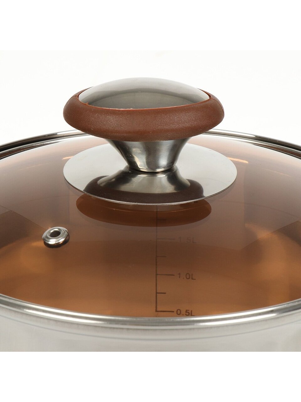 Диаметр кастрюли — 18 см, диаметр дна — 15 см, объём — 2,8 л, высота с крышкой — 17 см, вес — 0,95 кг. Крышка стеклянная, с выпускным клапаном.