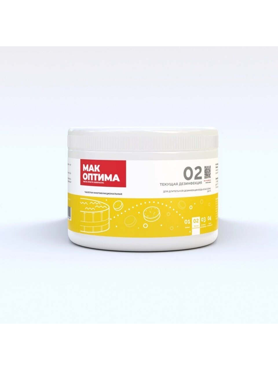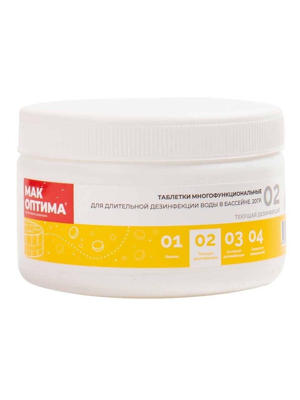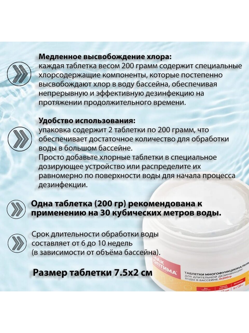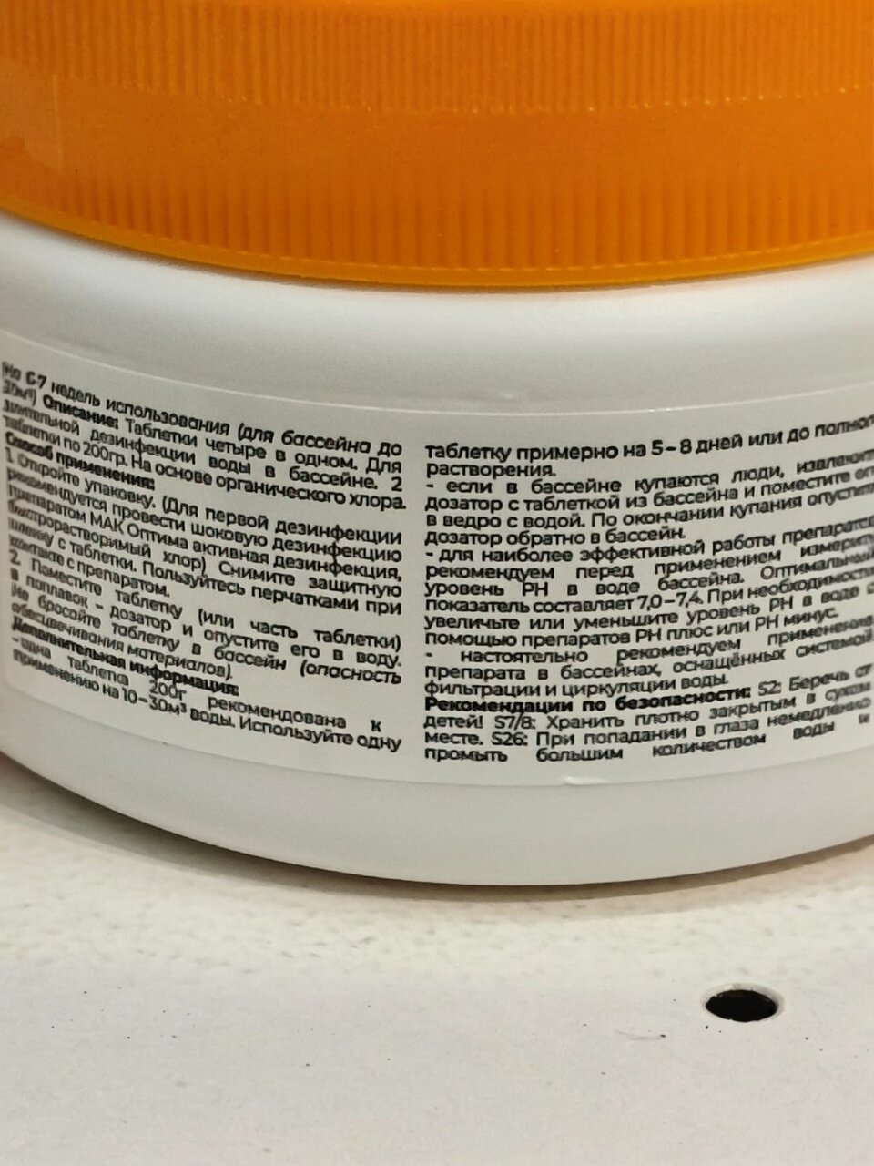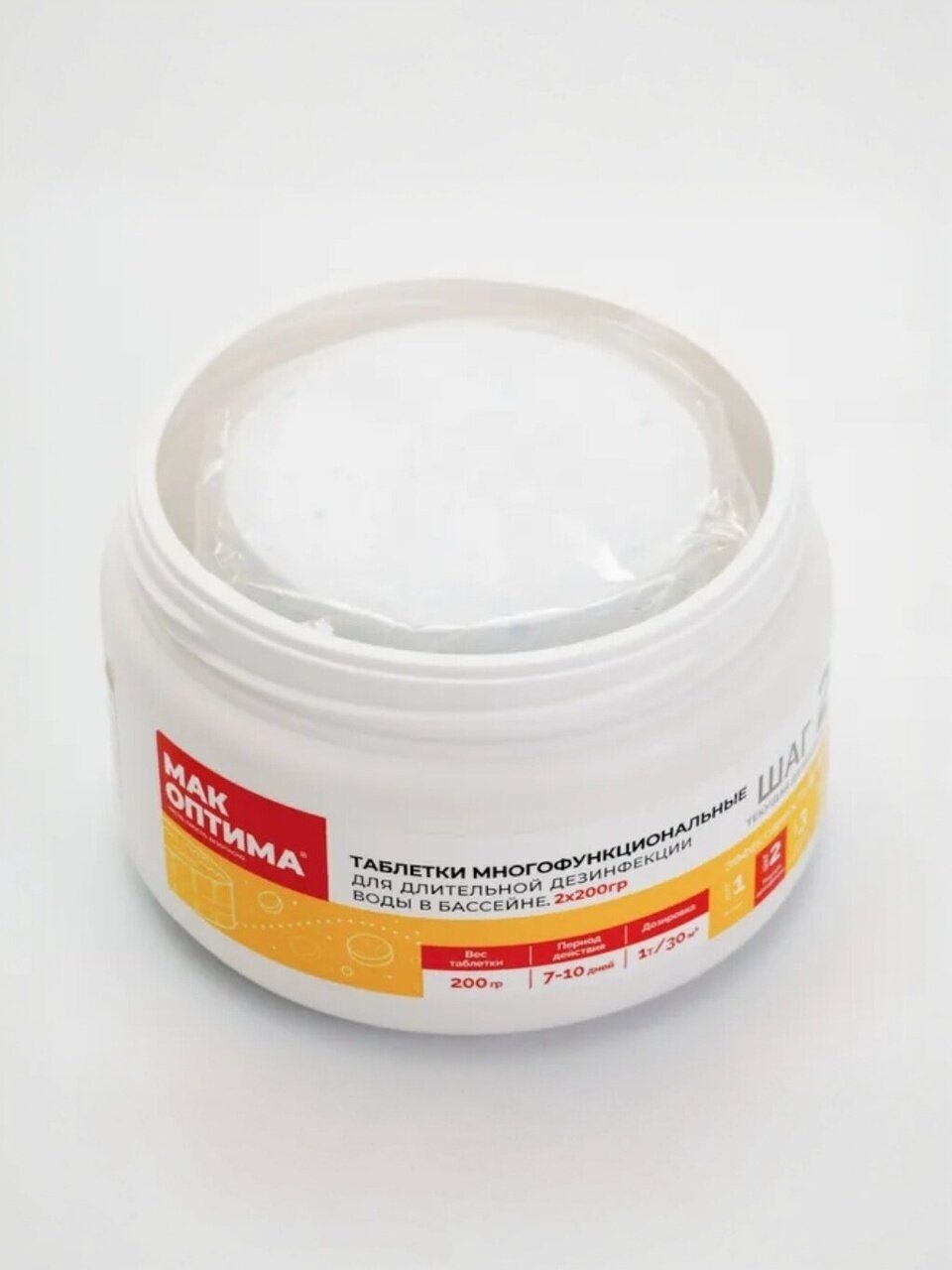 Средство представлено в форме таблеток, каждая из которых весит 200 г, что обеспечивает удобство в использовании и дозировке. Одна таблетка рекомендована к применению на 30 кубических метров воды. MAK 4 разработан на основе трихлоризоциануровой кислоты (симклозен), что гарантирует медленное и равномерное высвобождение активных компонентов, обеспечивая длительное действие и экономичное использование.