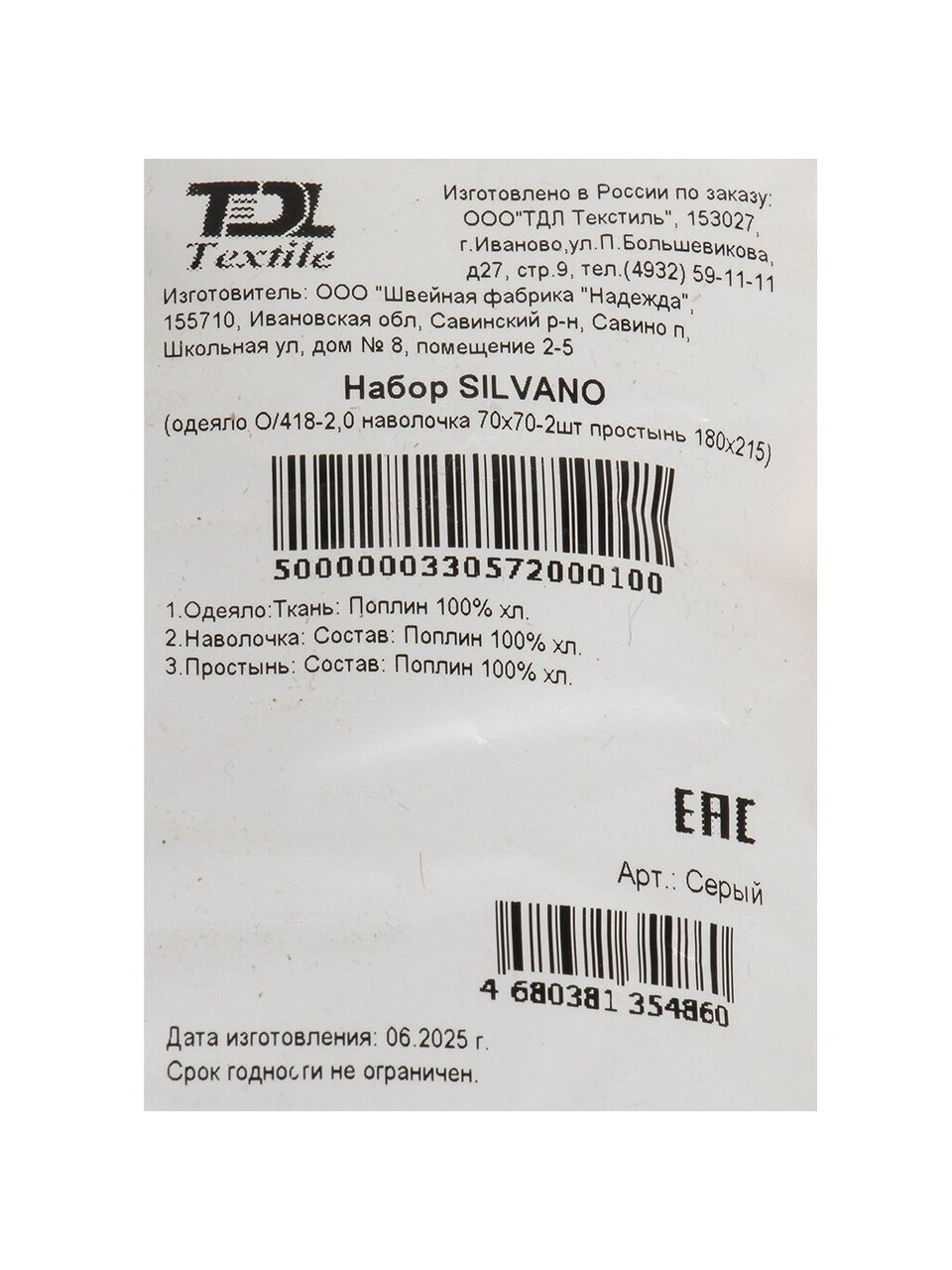 Комплект выполнен из 100% хлопка (поплин), пододеяльник без застёжки, что упрощает уход и использование.