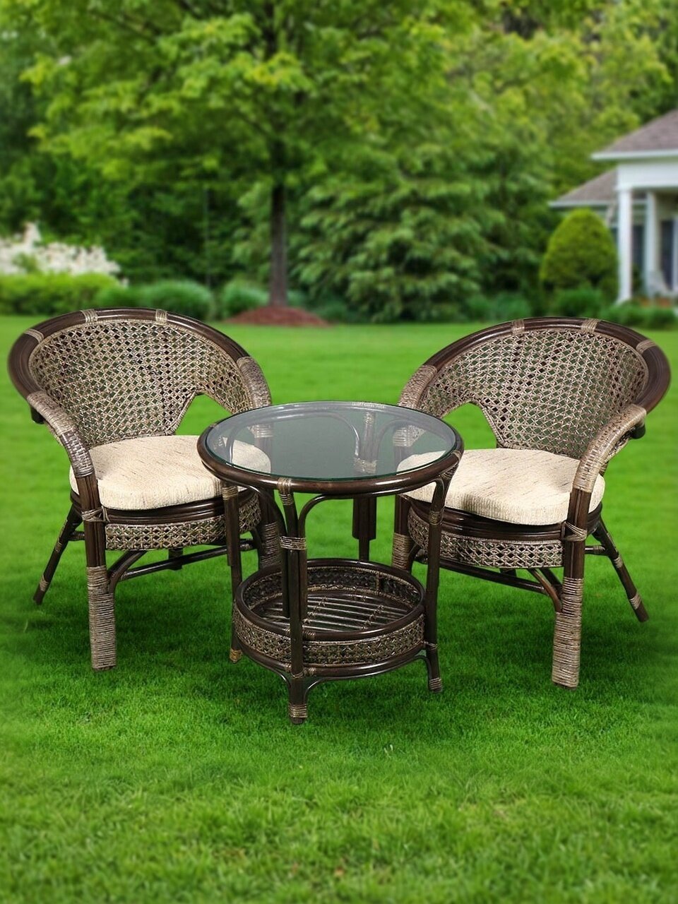 Набор садовой мебели включает небольшой столик с поверхностью из стекла, а также два кресла.