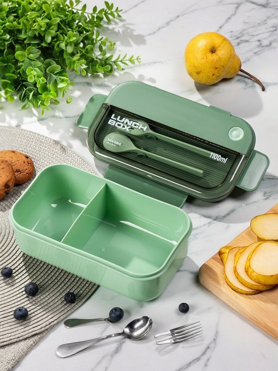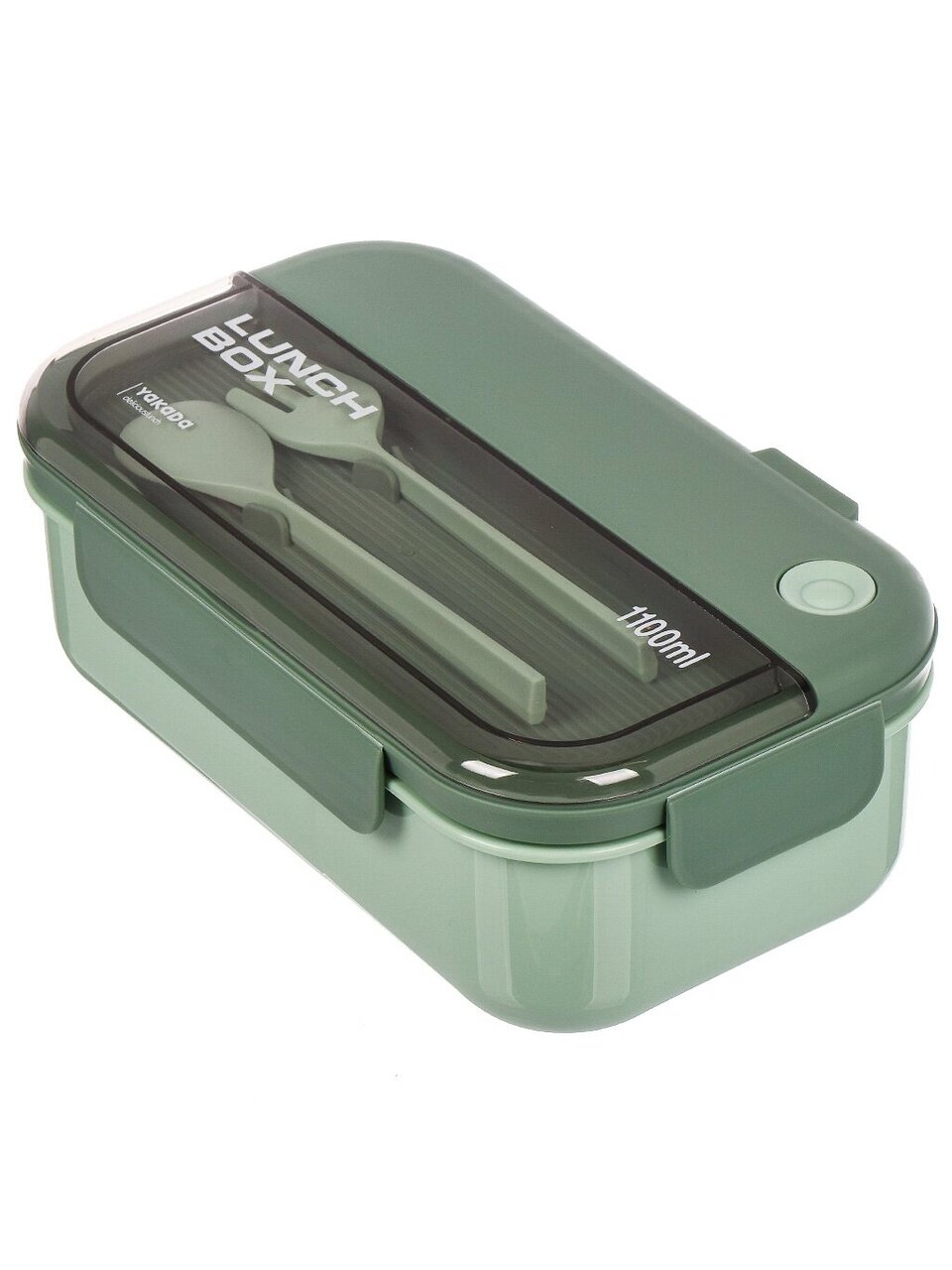 Универсальный пластиковый ланч-бокс 1.1 л: сохраните свежесть обеда дома, в офисе или на даче — герметичность, ложка и отсеки уже внутри.