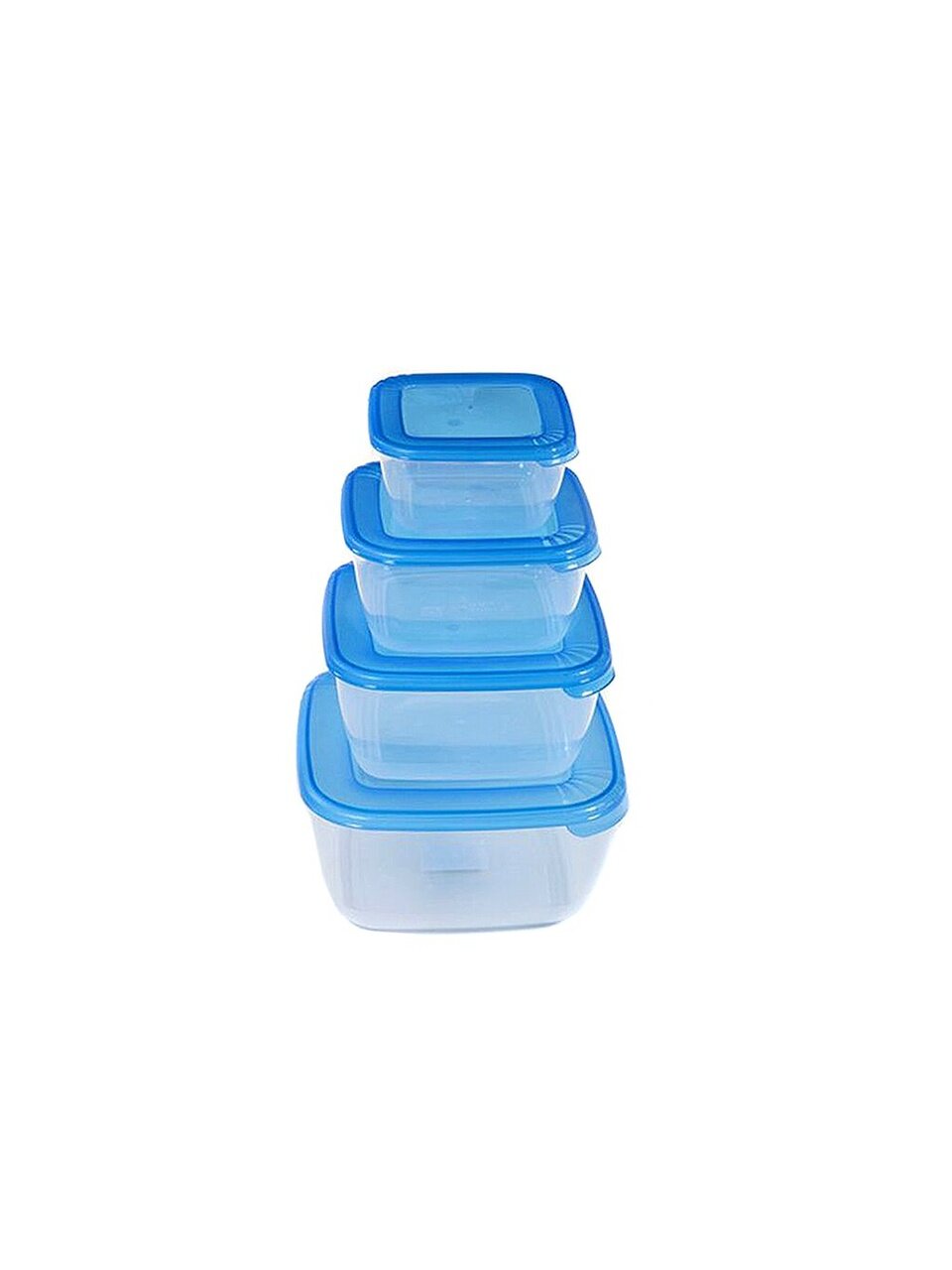 В комплекте 4 контейнера объёмом 0.46, 0.95, 1.5 и 2.5 литра, каждый высотой 10 см, с крышками, цвета в ассортименте.