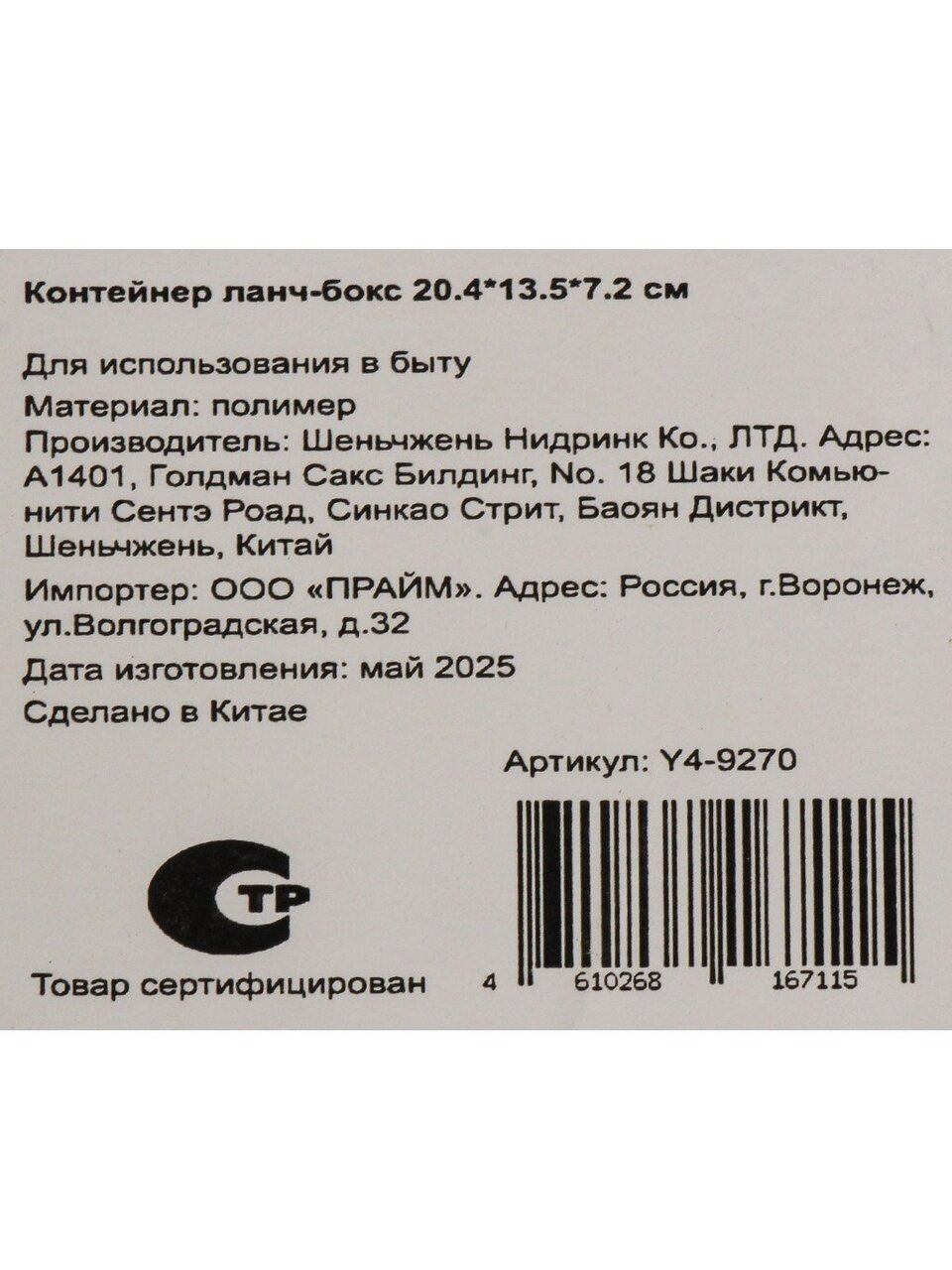 Контейнер ланч-бокс пластик, 20.4х13.5х7.2 см, прямоугольный, Y4-9270